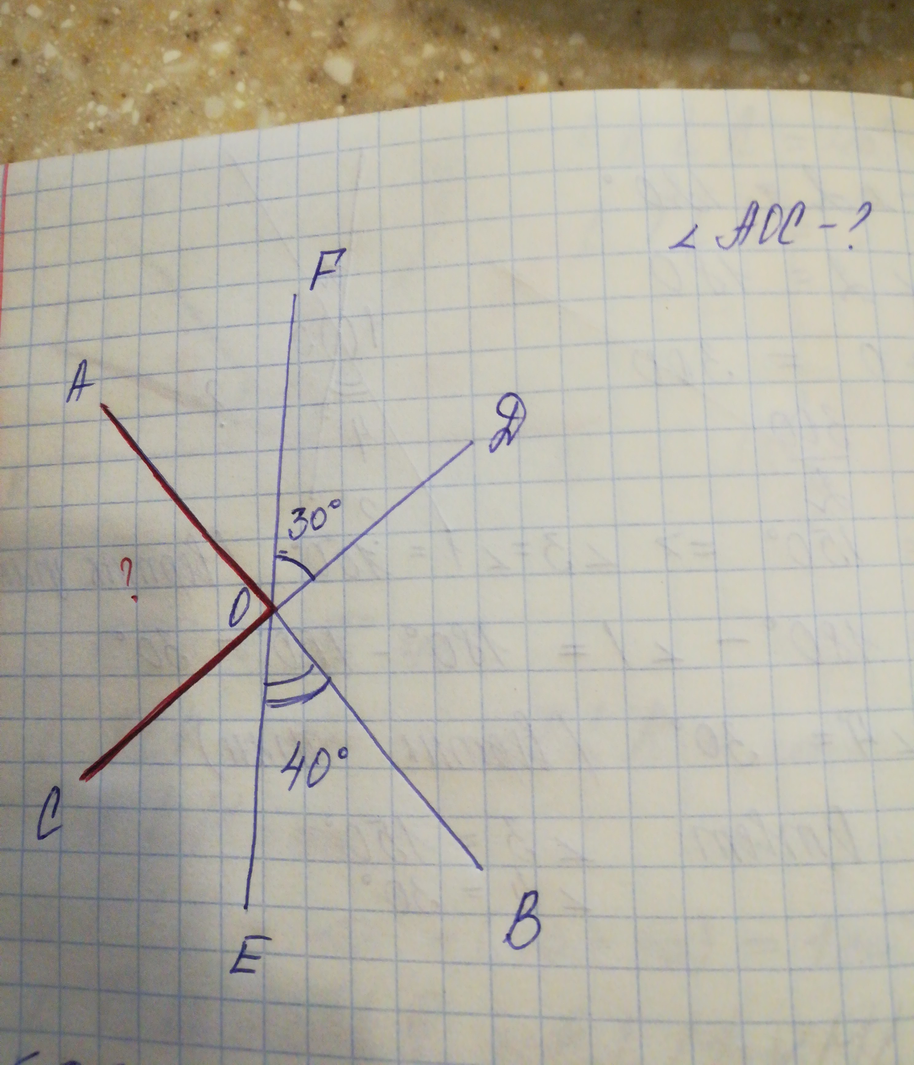 Угол СОЕ равен 30 градусов, так как он вертикален с углом FOD. Угол AOF равен 40 градусов, так как он вертикален с углом ЕОВ. Далее мы видим, что угол АOF, AOC и COE-смежные. Из этого следует, что угол АОС равен 180-(40+30)= 110 градусов.
