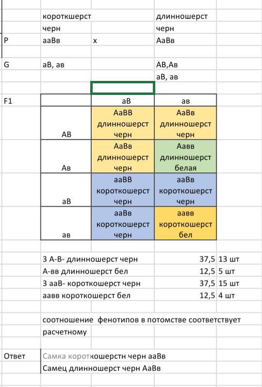 Длинношерстного чёрного самца морской свинки скрестили с чёрной короткошёрстной самкой. Получено 15 свинок с короткой чёрной шерстью, 13 - с длинной чёрной, 4 - с короткой белой, 5 - с длинной белой. Определите генотипы родителей, если длинная (А) и чёрная (B) шерсть являются доминирующими проявлениями признаков.