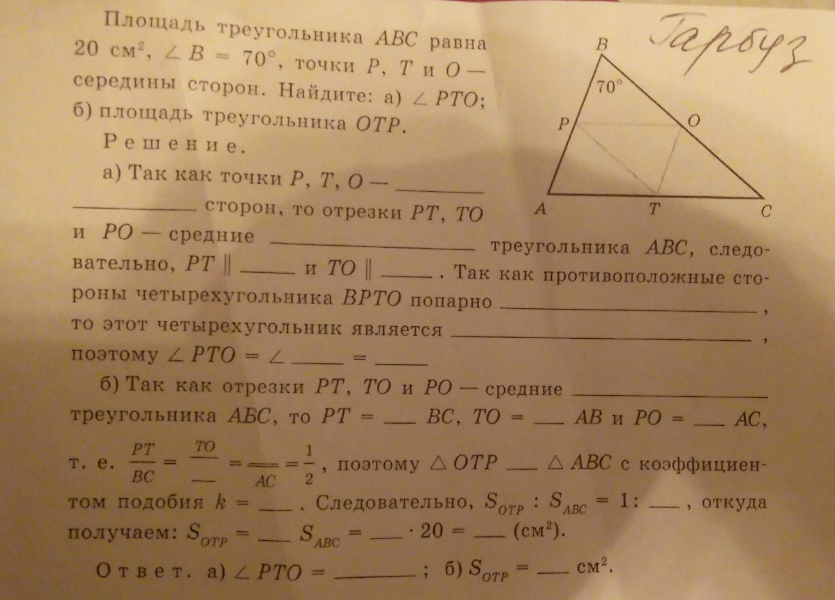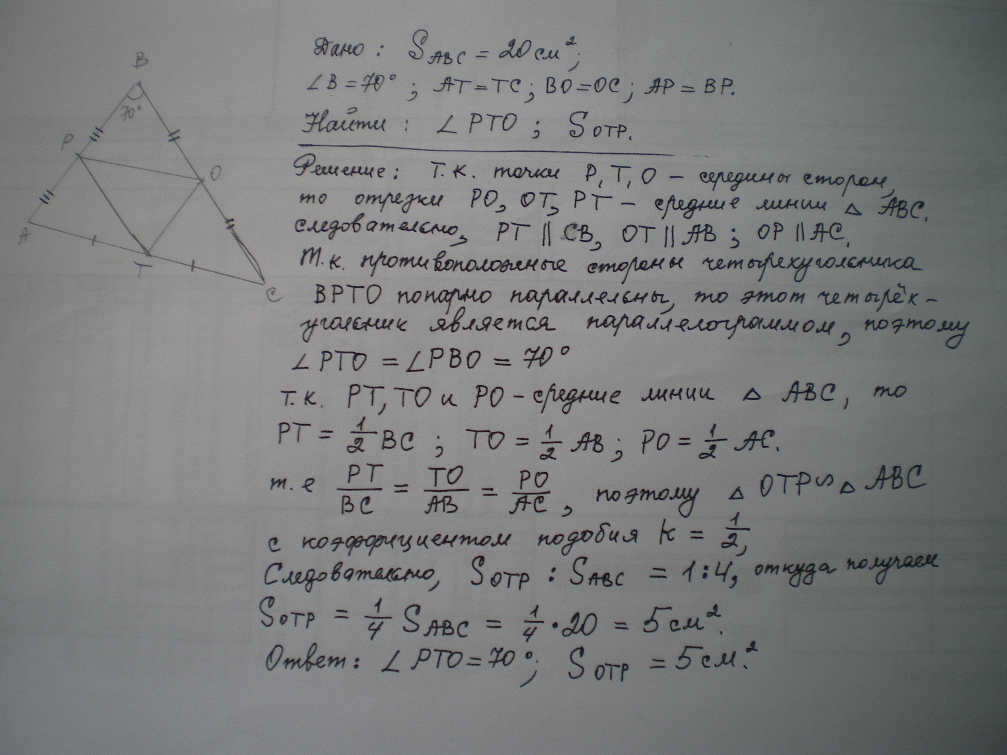 Площадь треугольника ABC равна 20см^2, угол B =70°, точки P, T и O - средние стороны. Найдите: а) угол PTO; б) площадь треугольника OTP