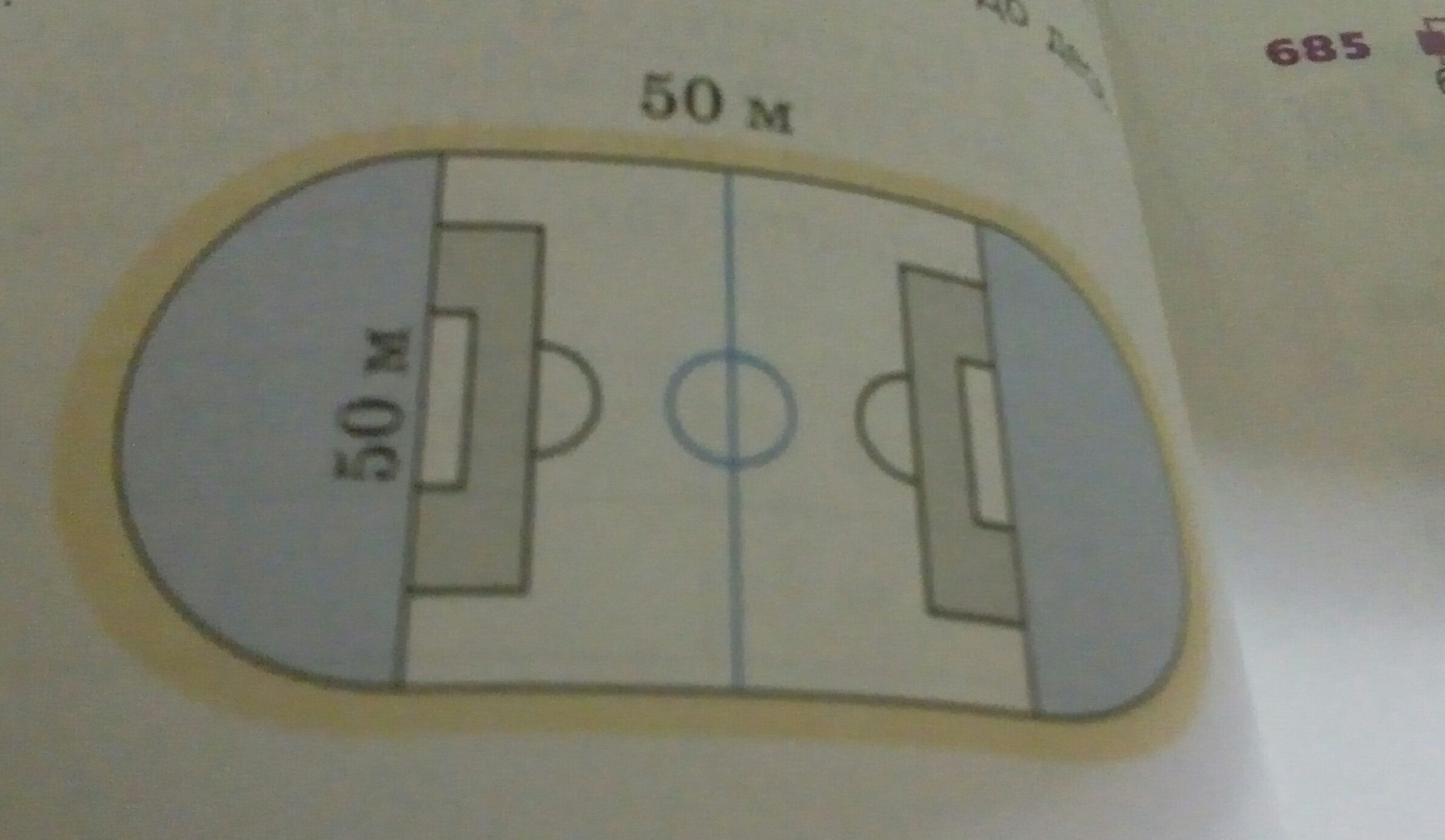 2) слева полукруг и справа полукруг диаметром 50 м - вместе они дают круг, ищем площадь круга