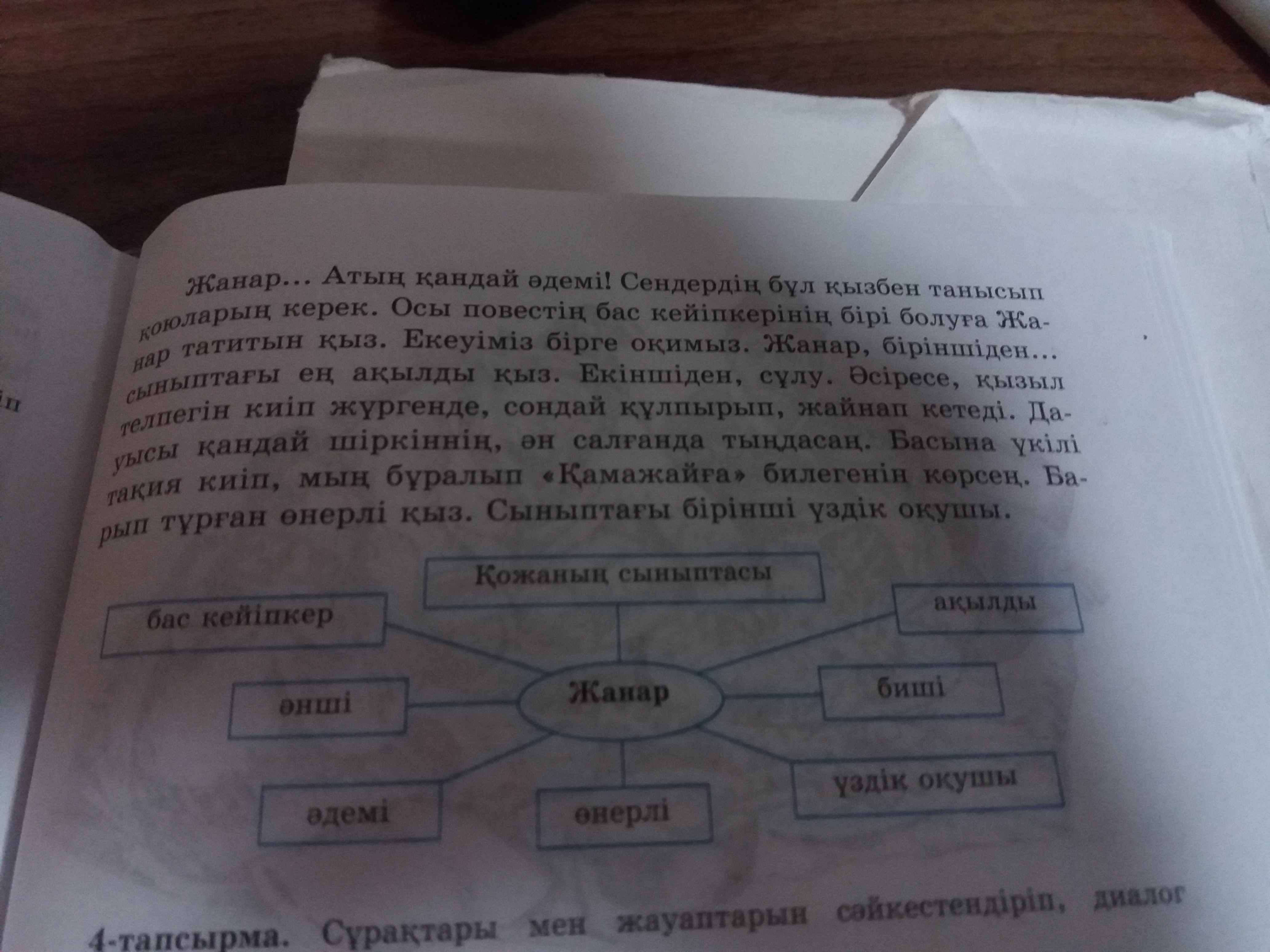 Жанар повестің басты кейіпкері. Ол Қожаның сыныптасы. Ең үздік оқушы. Өзі əдемі əрі ақылды. Дауысы керемет əнші жəне өнерлі биші.