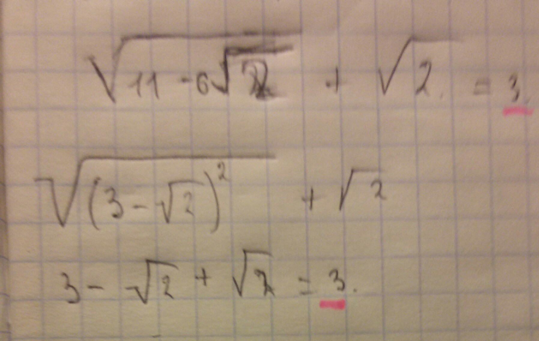 Помогите решить пример *корень 11-6корень из2 корень закрывается* + корень из2 (выражение под корнем большим обозначены *)