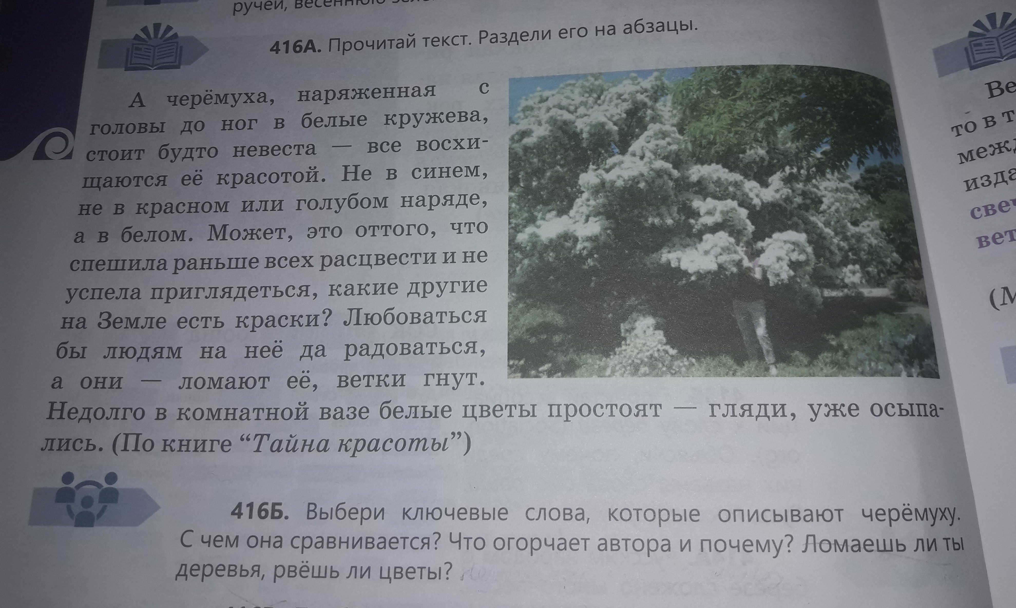 Сравнивает св с невестой огорчает автора то что люди ломают ветви черемухи.