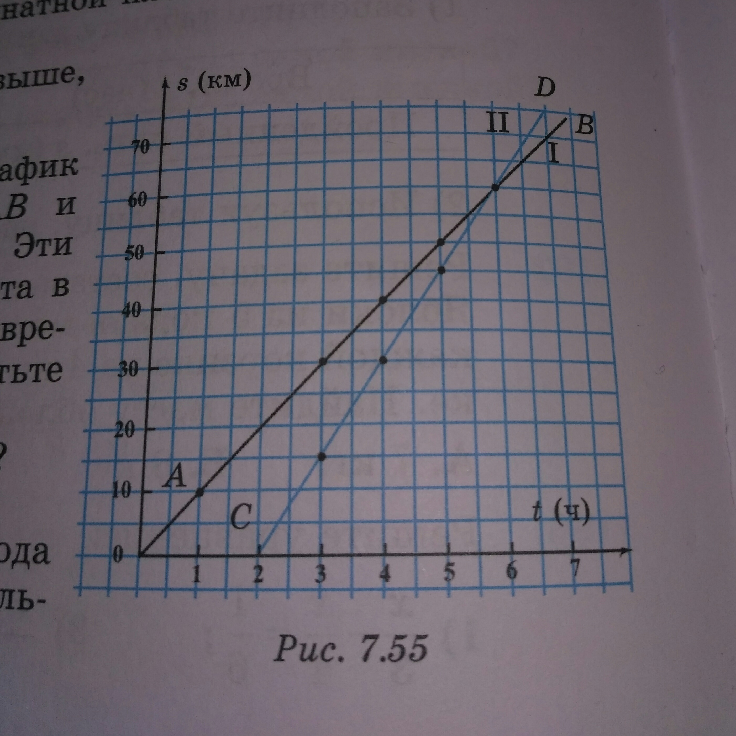 На рисунке 7.55 изображены график движения весельной лодки AB и график движения байдарки CD. Эти лодки отплыли из одного пункта в одном направлении, но в разное время. Вычислив по графику, ответьте на вопросы: