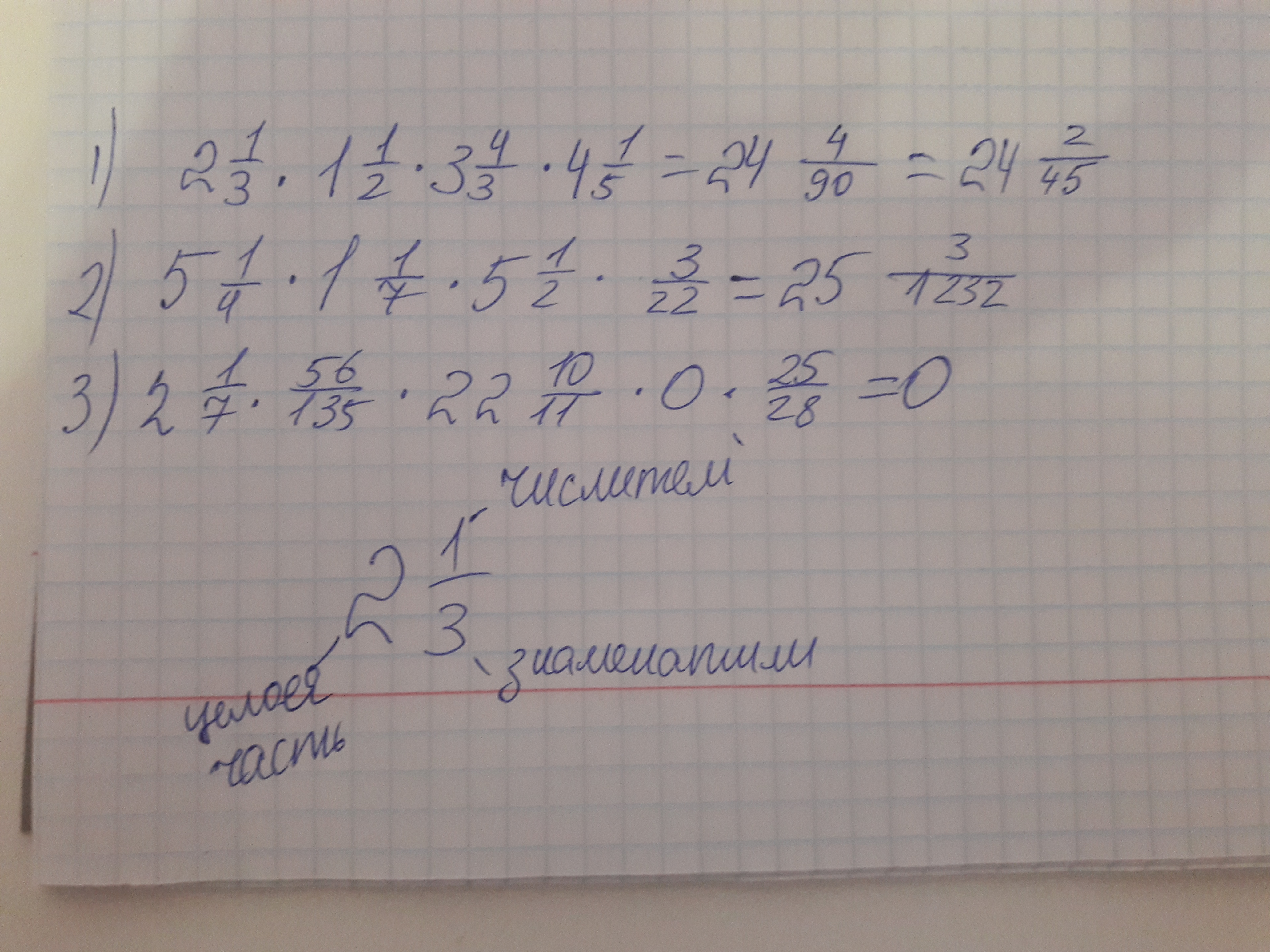 целые части умножаем на целые части и результат записываем в ответе как целую часть. Чиселькы на числительные, знаменатели на знаменатели, в результат в ответе на свое место