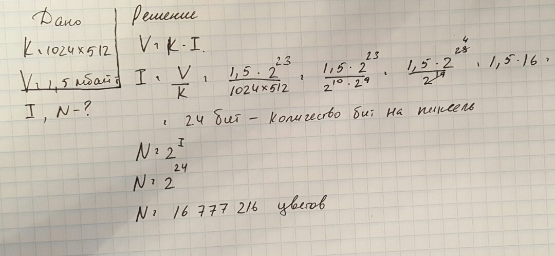 Рисунок размером 1024*512 пикселей сохранили в виде несжатого файла размером 1,5 Мбайт. Какое количество информации было использовано для кодирования цвета пикселя? Каково максимально возможное число цветов в палитре, соответствующей такой глубине цвета?