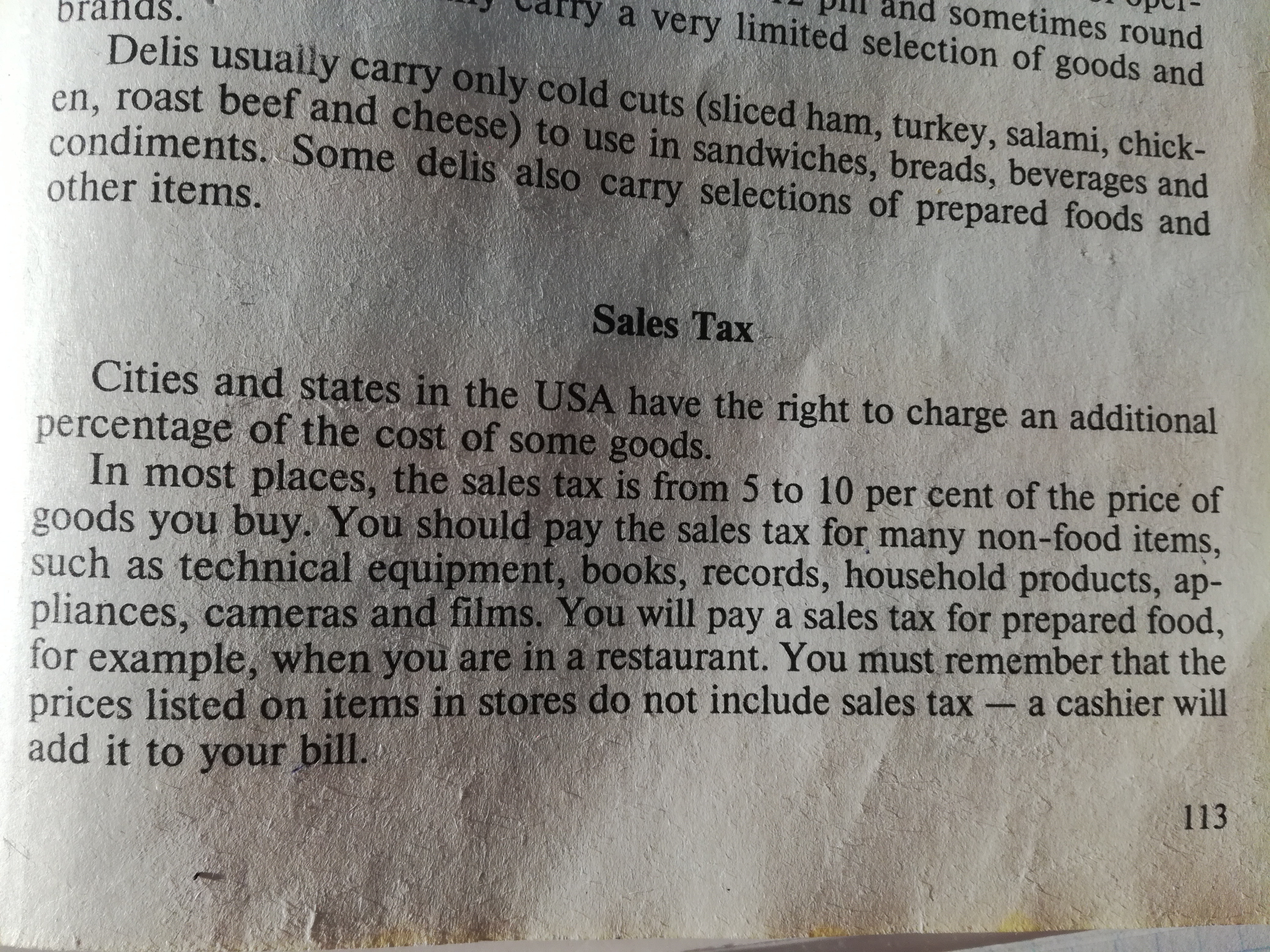 Продажи Налоговые города и штаты США имеют право взимать дополнительную плату за некоторые товары. В большинстве мест налог с продаж составляет от 5 до 10 процентов от цены покупки. Вы должны оплачивать продажи как техническое оборудование, книги, записи, предметы домашнего обихода, аппликации, камеры и фильмы. Вы платите за таву за приготовленную пищу. или пример, когда вы находитесь в ресторане. Вы помните, что вложенные в предметы в магазинах не включают салестарды, которые я сделал на ваш счет.