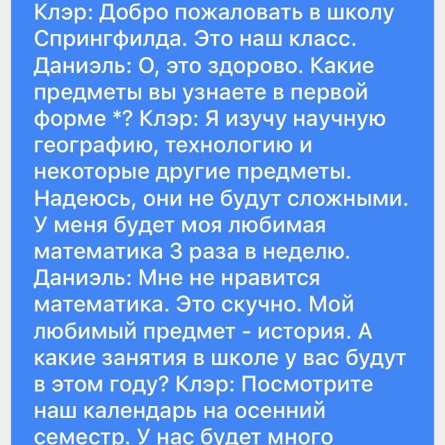 Д: я не люблю математику. Она скучная. Мой любимый предмет - это история. И какие занятия после школы будут у тебя в этом году?
