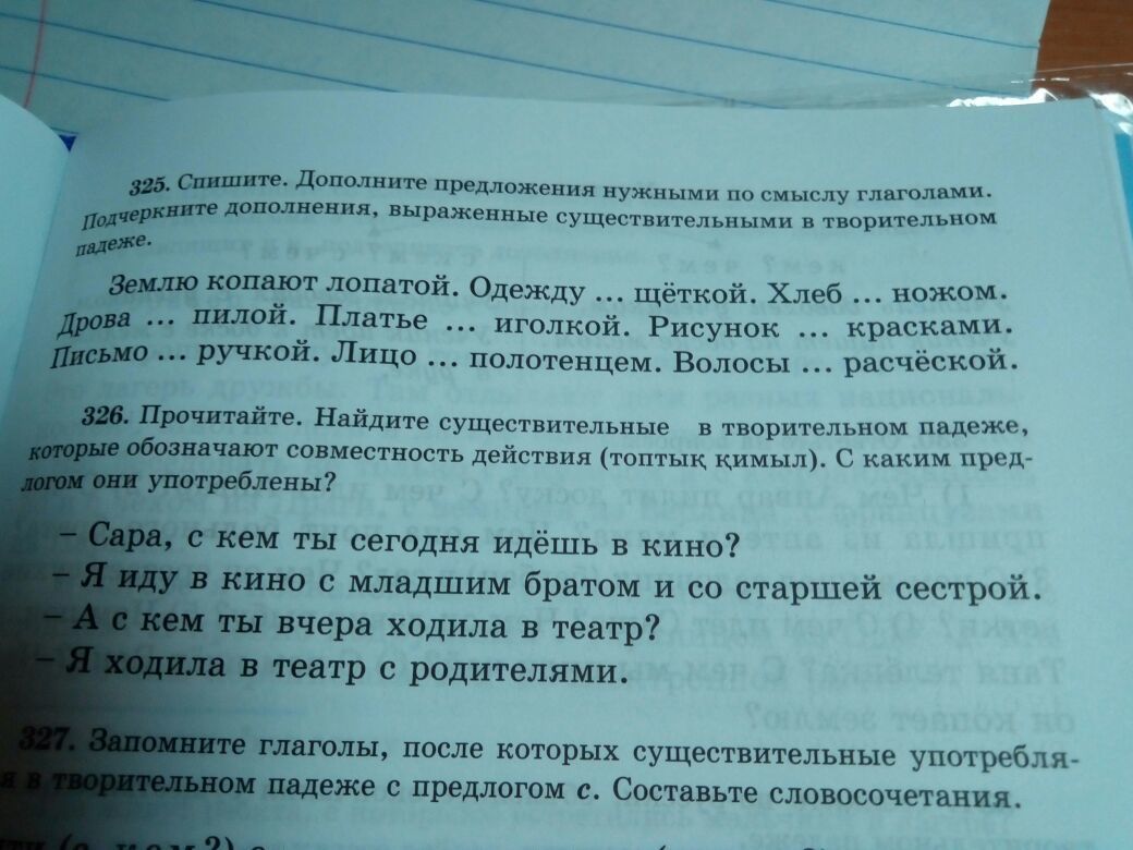 одежду чистят щёткой. Хлеб режут ножом. Дрова пилят пилой. Платье шьют иголкой. Рисунок рисуют красками. Письмо пишут ручкой. ЛИцо вытирают полотенцем. Волосы расчёсывают расчёской