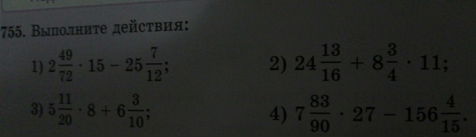 выполните дейстия 1)2 целых 49/72*15-25целых 7/12; 2) 24целых 13/16+8 целых3/4*11;3) 5целых 11/20*8+6целых 3/10;4)7целых 83/90*27-156 целых 4/15
