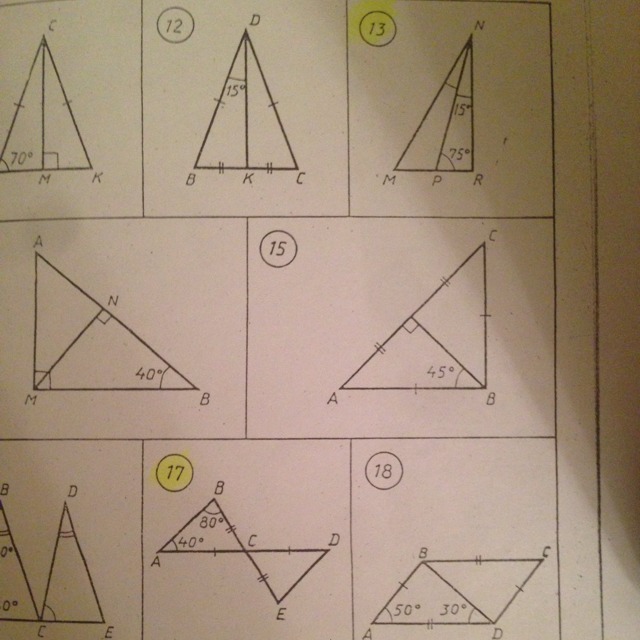 Вычислите все неизвестные углы треугольника пожалуйста (только 13 и 17) заранее спасибо!!!!!!