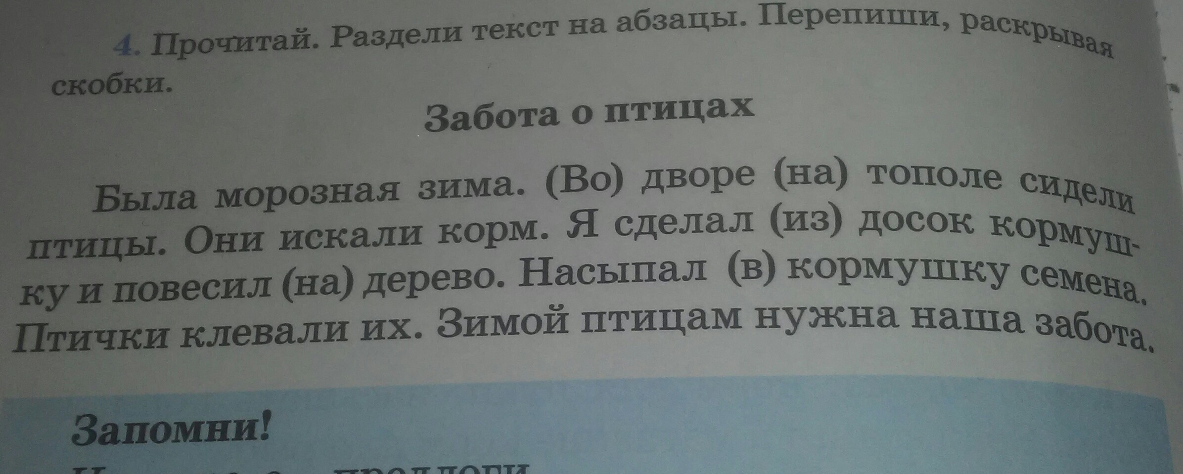 Была морозная зима.Во дворе на тополей сидели птицы.Они искали корм.Я сделал из досок кормушку и повесил на дерево.Насыпал в кормушку семена.Птички клевали их.Зимой птицам нужна наша забота