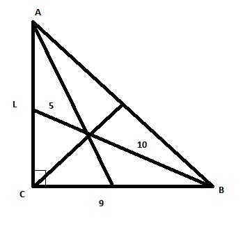 Так как медианы пересекаються, тогда о теореме они деляться в соотношении 2/1. Отсюда так как OB=10, тогда OL=10/2=5см. Из треугольника BCL (∠BCL=90°) За т.Пифагора: