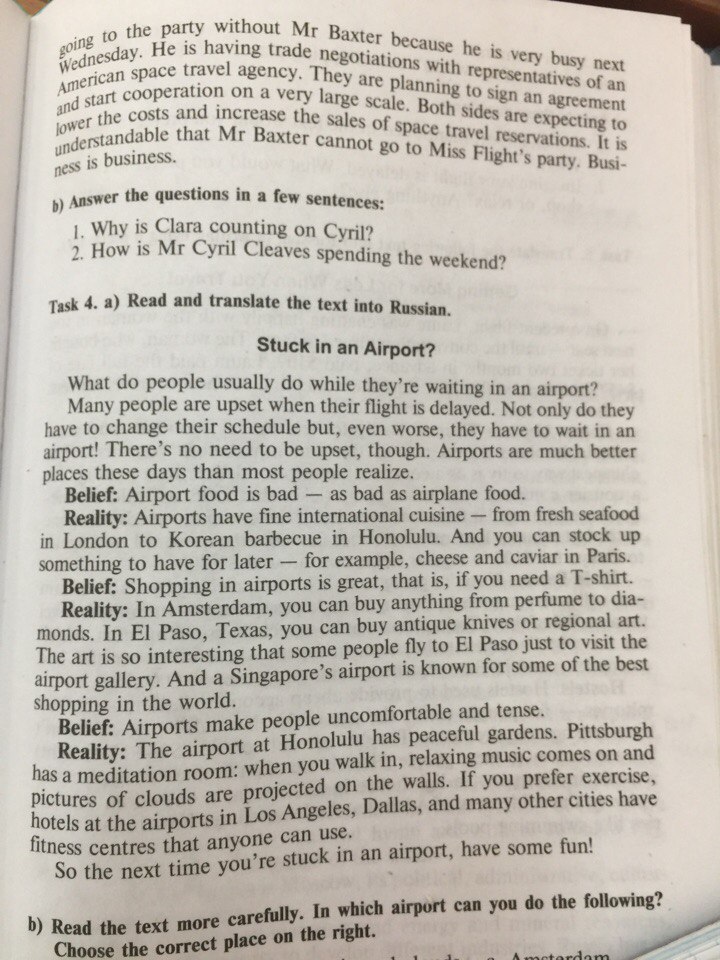 Застрял в аэропорту? Что обычно делают люди, когда они ждут в аэропорту? Многие люди расстроены, когда их полет задерживается. Мало того, что они должны менять свой график, но, что еще хуже, им приходится ждать в аэропорту! Однако нет необходимости расстраиваться. Аэропорты гораздо лучше места в эти дни, чем большинство людей осознают. Вера: еда в аэропорту плохой, как еда в самолете. Реальность: аэропорты имеют прекрасную международную кухню - от свежих морепродуктов в Лондоне до корейского барбекю в Гонолулу. И вы можете запастись чем-то, что нужно для более позднего, например, сыра и икры в Париже. Вера Покупки в аэропортах - это то, что вам нужна футболка. Реальность: в Амстердаме вы можете купить что угодно - от духов до диам. В Эль-Пасо, штат Техас, вы можете купить антикварные ножи или областное искусство. Искусство настолько интересно, что некоторые люди летают в Эль-Пасо только для того, чтобы посетить галерею аэропорта. И аэропорт Сингапура известен одними из лучших магазинов в мире. неудобно и напряженно. Вера: Аэропорты делают людей Pittsburgh Реальность: В аэропорту Гонолулу есть мирные сады. на и есть комната для медитации: когда вы ходите, расслабляющая музыка приходит, картины на облаках проецируются на стены. Если вы предпочитаете упражнение. отели в аэропортах в Лос-Анджелесе, Далласе и во многих других городах имеют фитнес-центры, где любой может повеселиться! Поэтому в следующий раз, когда вы застряли в аэропорту, b) внимательно прочитайте текст. В каком аэропорту вы можете сделать следующее? Выберите правильное место справа