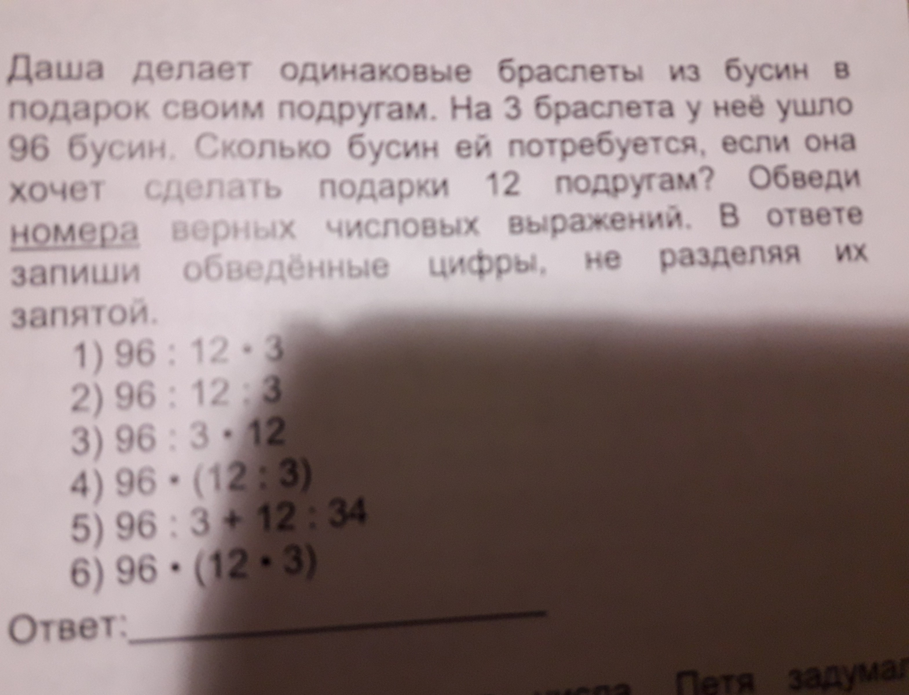 Даша делает одинаковые браслеты из бусин в подарок своим подругам. На 3 браслета у неё ушло 96 бусин. Сколько бусин ей потребуется, если онахочет сделать подарки 12 подругам? Обведи номера верных числовых выражений.