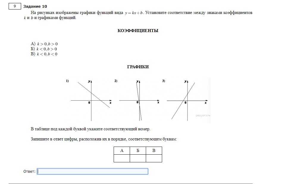 По условию к>0 только на графике 3) Здесь прямая слева направо возрастает. Уже сразу понятно, что это А, так как два других графика прямая имеет другое направление - они падают слева направо.