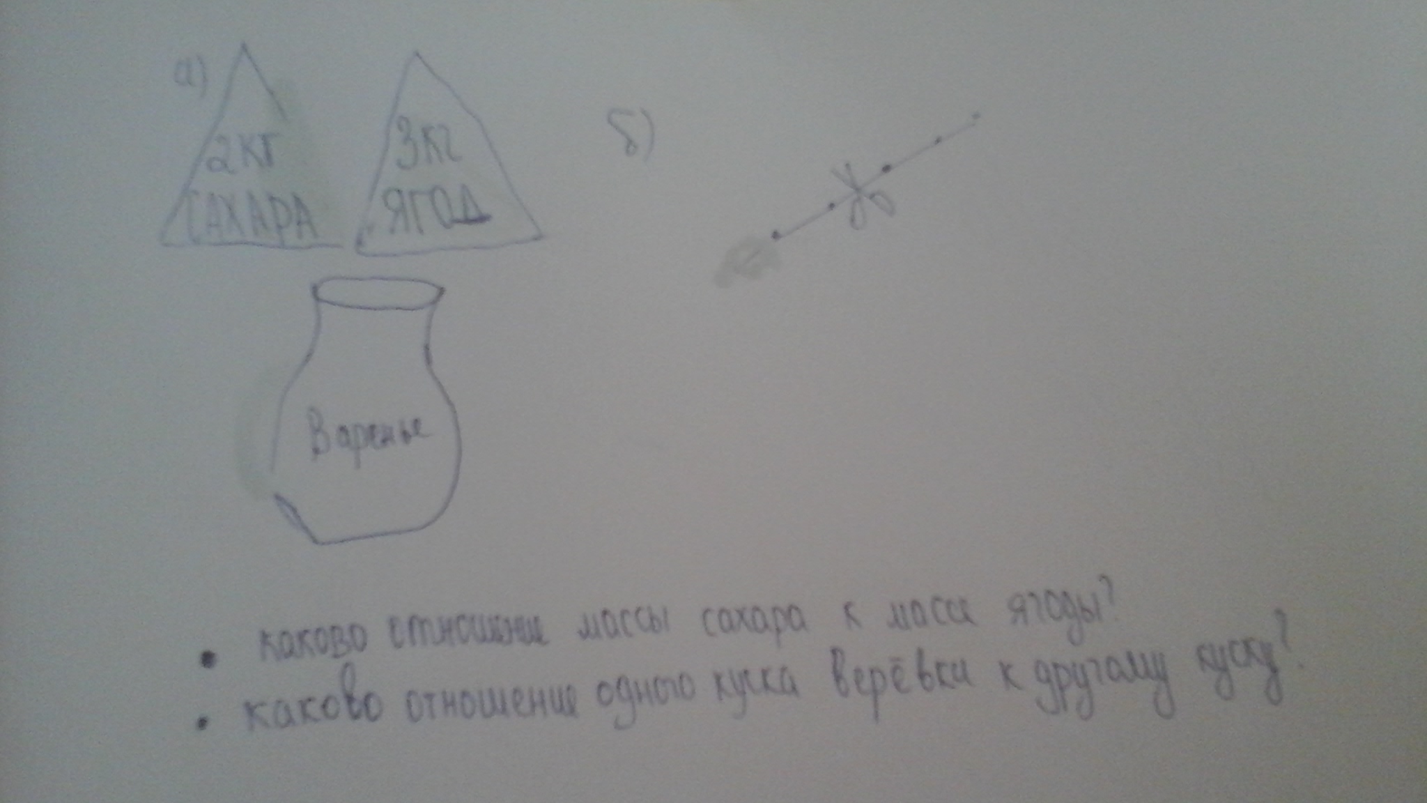тебе в задании написано 2 кг сахара и 3 кг ягод их килограммы это и есть отношение а в веревке считай сколько кусков с одной стороны до ножниц и с другой .Сократить можешь если хочешь от этого ничего не изменится