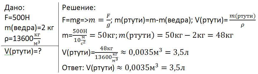человек может поднять груз весом 500 Н. Какой объём ртути можно налить в ведро, чтобы его смог поднять этот человек, если масса пустого ведра 2 кг.Плотность ртути 13600 кг