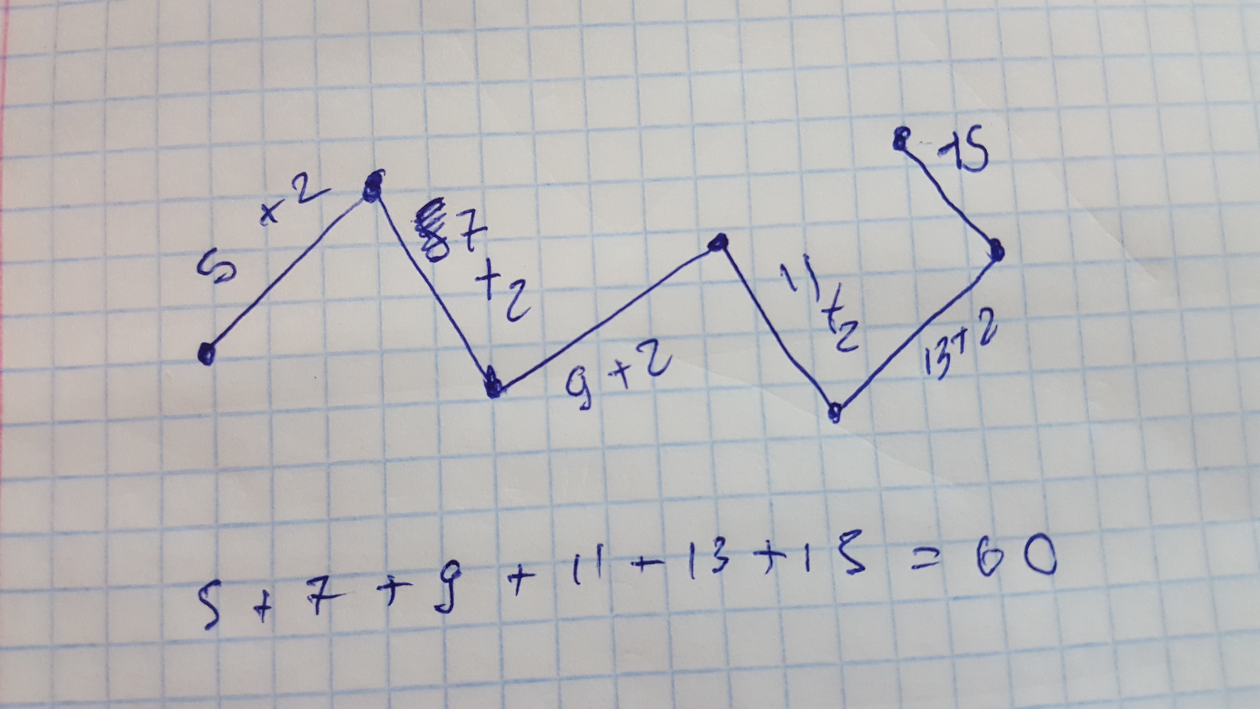 Все просто, для начала начертим 6 звеньев. 1ое звено =5 далльше прибавляем по 2 к каждому последующему