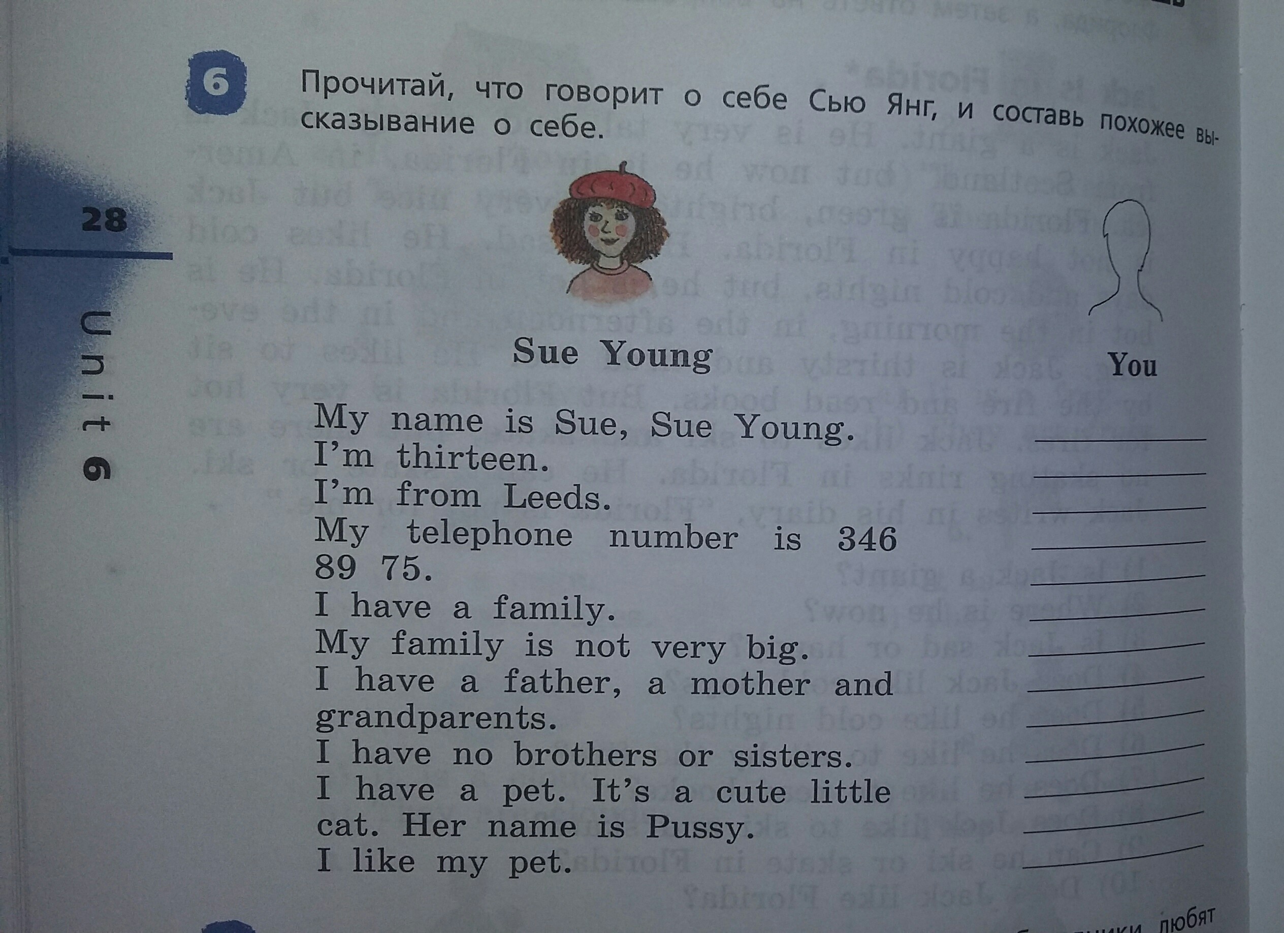 My name is oksana. I'm (твой возраст). I'm from Russia. My telephone number is 8-800-555-35-35. I have a family. My family is big. I have a mother, father sister. I have a fish. He is very small. His name is Baddy. I like my pet.