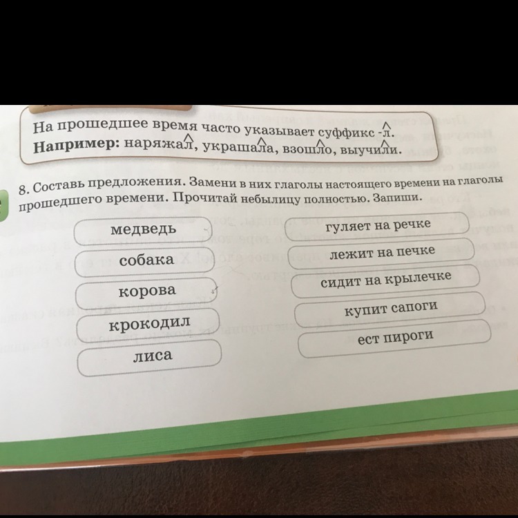 Медведь купил сапоги. Собака сидела на крылечке.Корова ела пироги.Крокодил гулял на речке.Лиса лежала на печке.