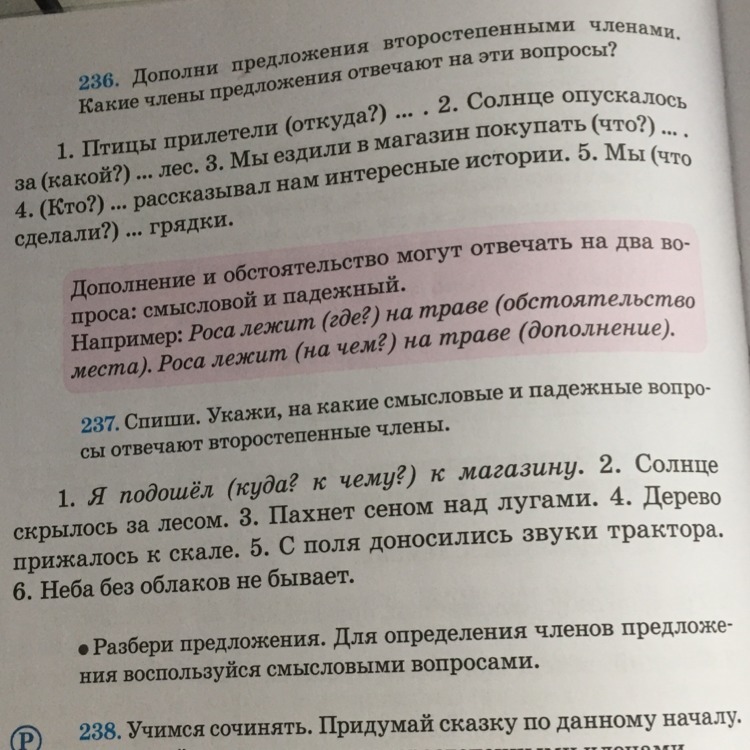 Солнце скрылось(за чем?) за лесом.Пахнет сеном(где?над чем?) над лугами.Дерево прижалось( к чему?куда?) к скале.С поля доносились звуки( чьи? чего?) трактора. Небо без облаков( какое?как?) не бывает.