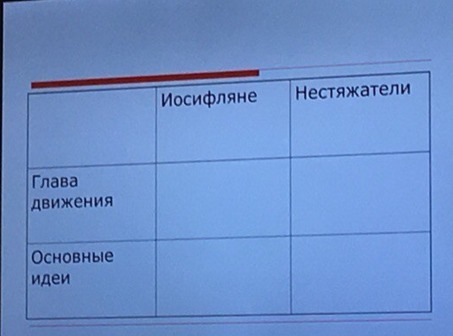 Нестяжатели: Нил Сорский руководитель,Нестяжатели настаивали на ликвидации монастырского землевладения, считая, что монахи должны вести аскетический образ жизни ничего не иметь и питаться лишь плодами собственного труда.Они считали также что церковь должна быть не зависима от гражданских властей.