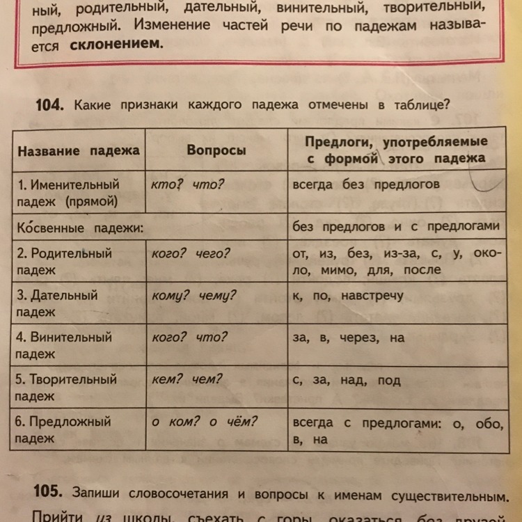 В таблице отмечены признаки:употребляется ли этот падеж с предлогом или можно ли его употребить с предлогом,какие вопросы имеет каждый падеж.