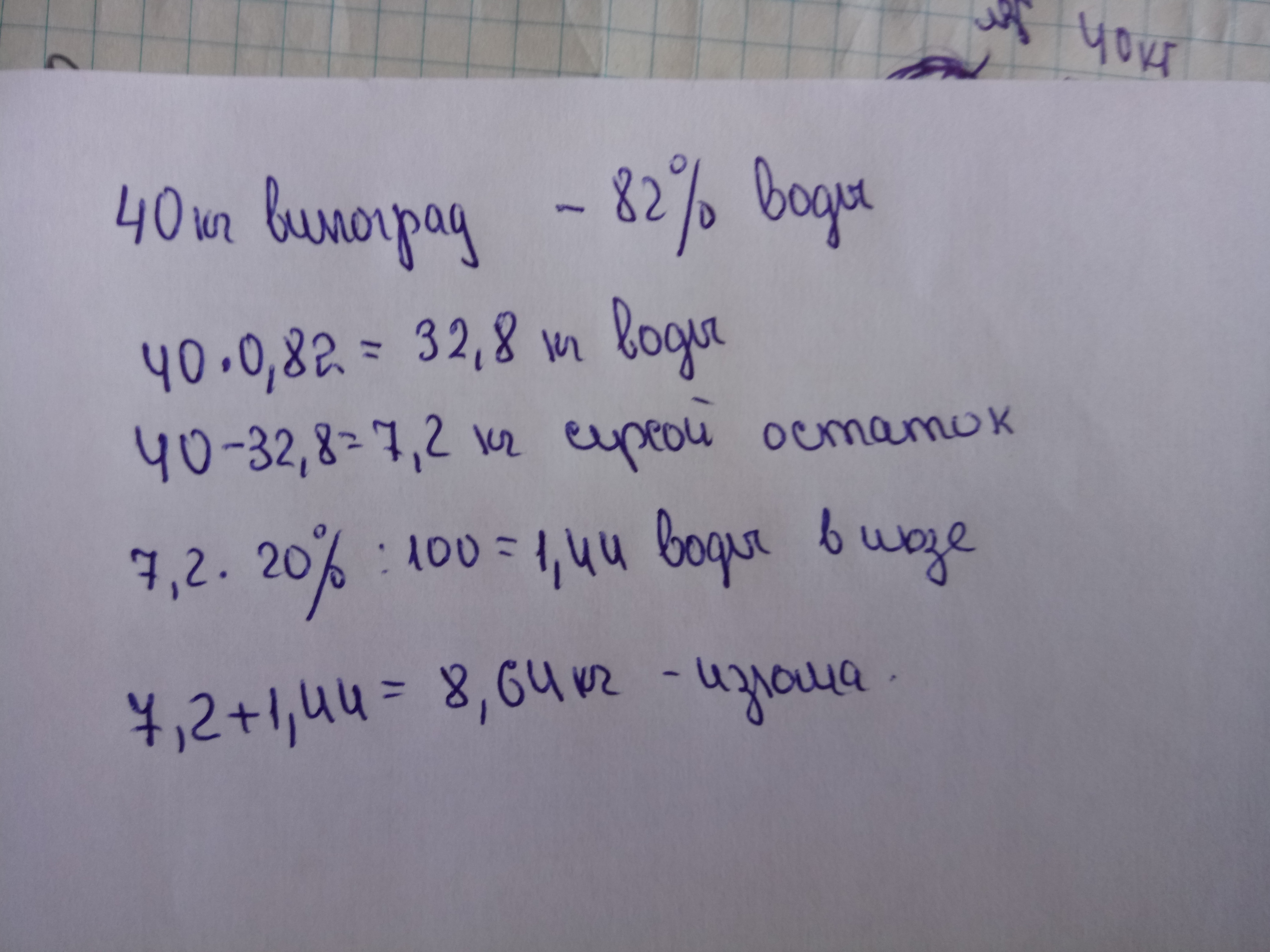 Изюм получается в процессе сушки винограда.. Сколько изюма получится из 40 кг, если виноград содержит 82% воды, а изюм содержит 20% воды.