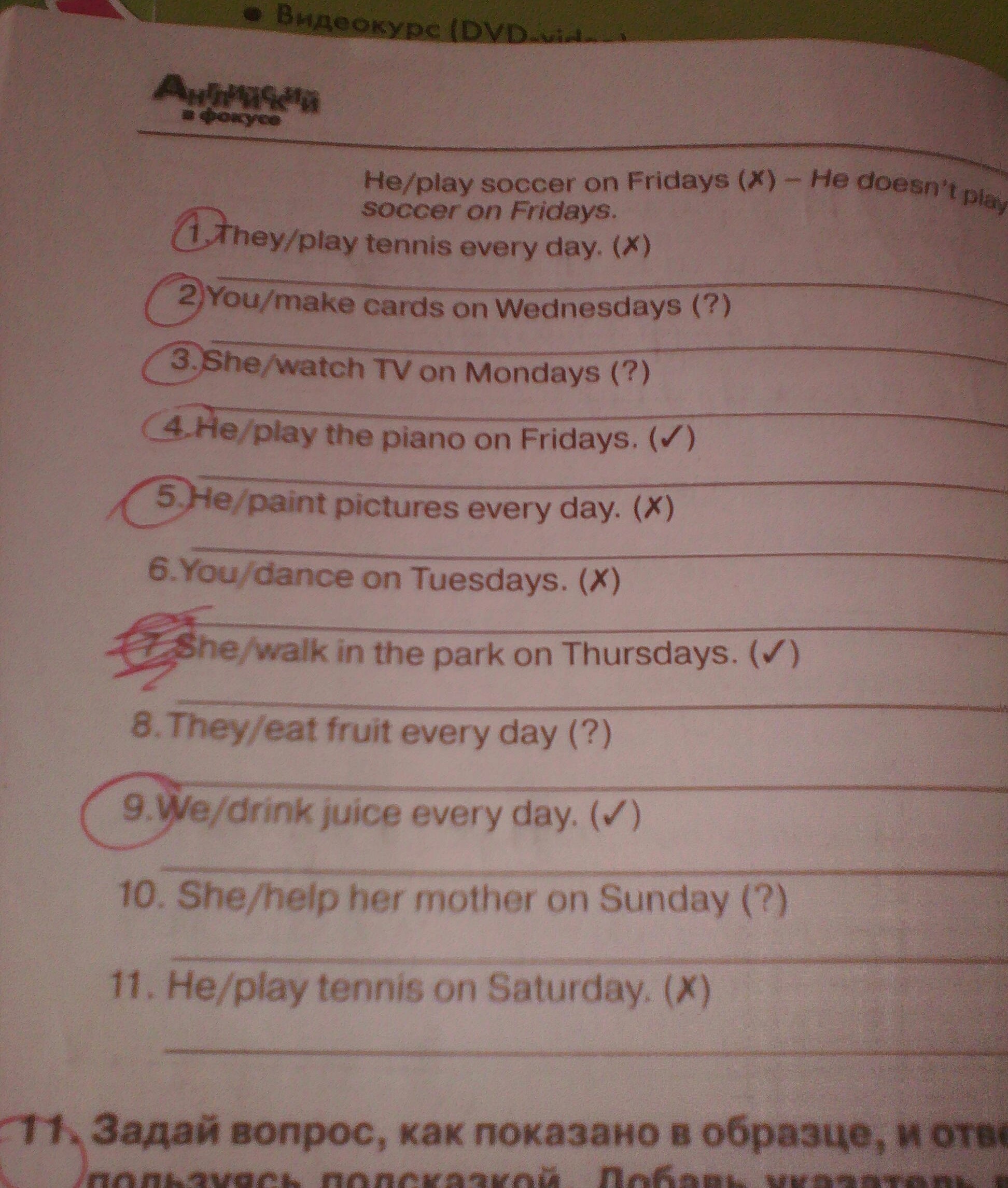 11)He doesn't play tennis on Saturdays.