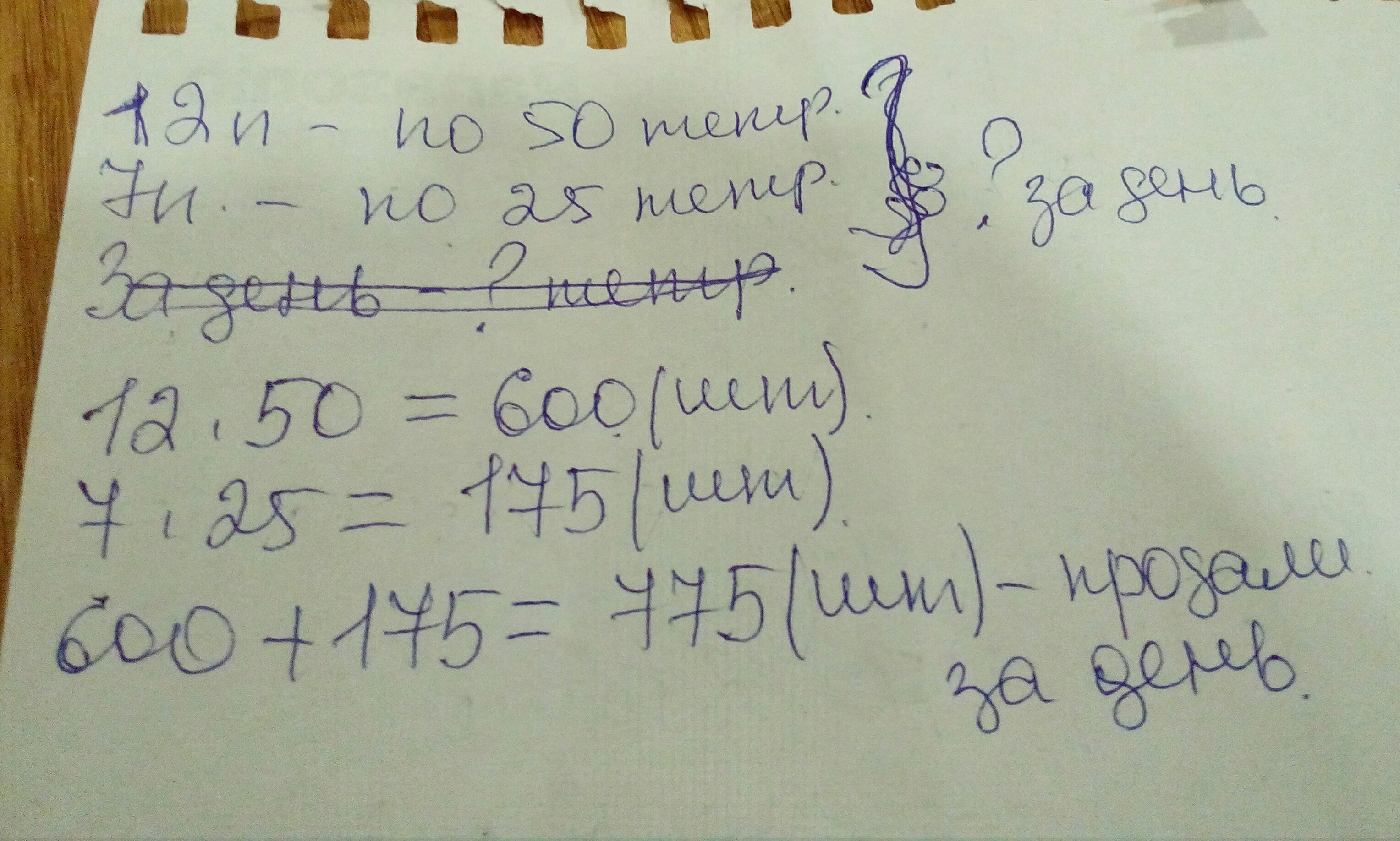 В магазине канцелярских товаров за день продали 12 пачек тетрадей по 50 тетрадей в каждой и 7 пачек общих тетрадей по 25 тетрадей в каждой. Сколько всего тетрадей продали за день в магазине?