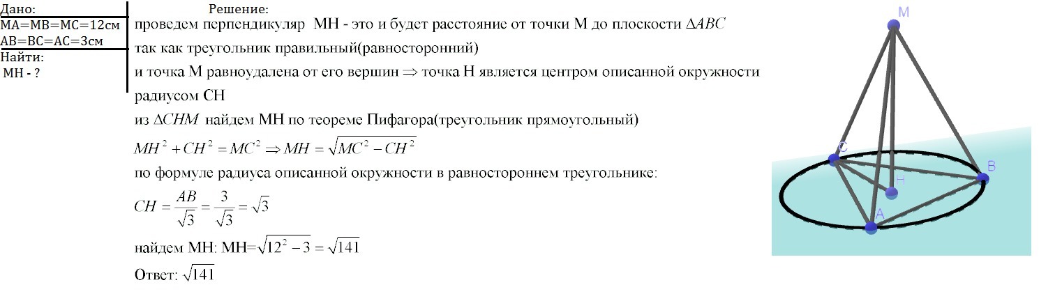 точка m равноудалена на 12 см от вершин правильного треугольника со стороной 3 см Найти растояние от точки M до плоскости треугольника