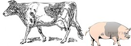 На рисунке изображены корова и свинья. Длина тела свиньи составляет 1,2 м. Определите примерную длину тела коровы в метрах (с точностью до десятых).
