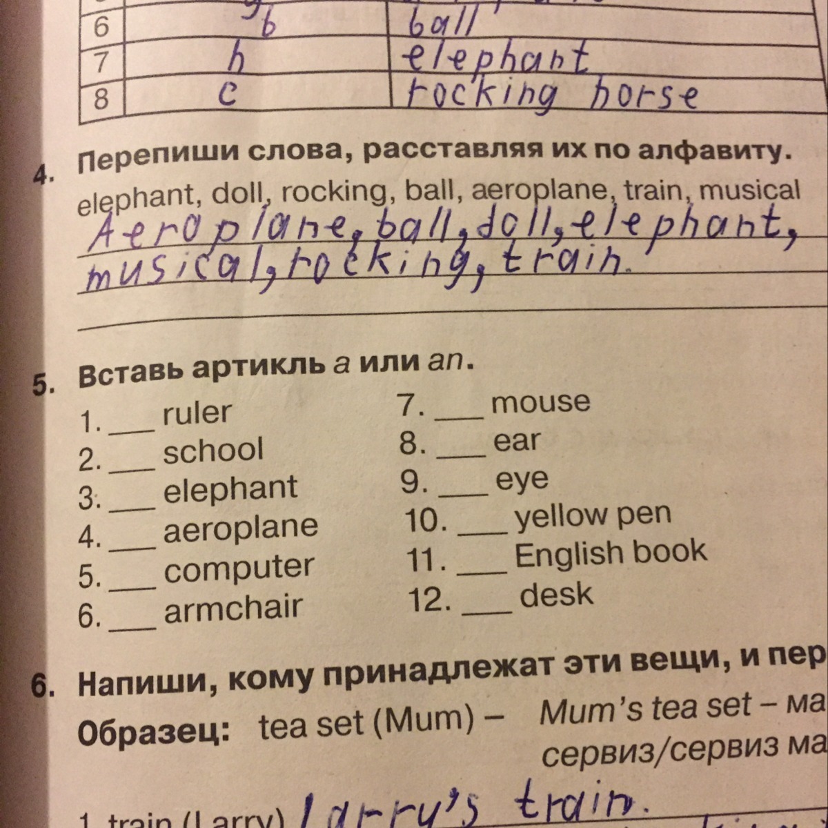 a ruler , a school, an elephant, an aeroplane, a computer , an armchair , a mouse , an ear , an eye , a yellow pen , an English book, a desk.