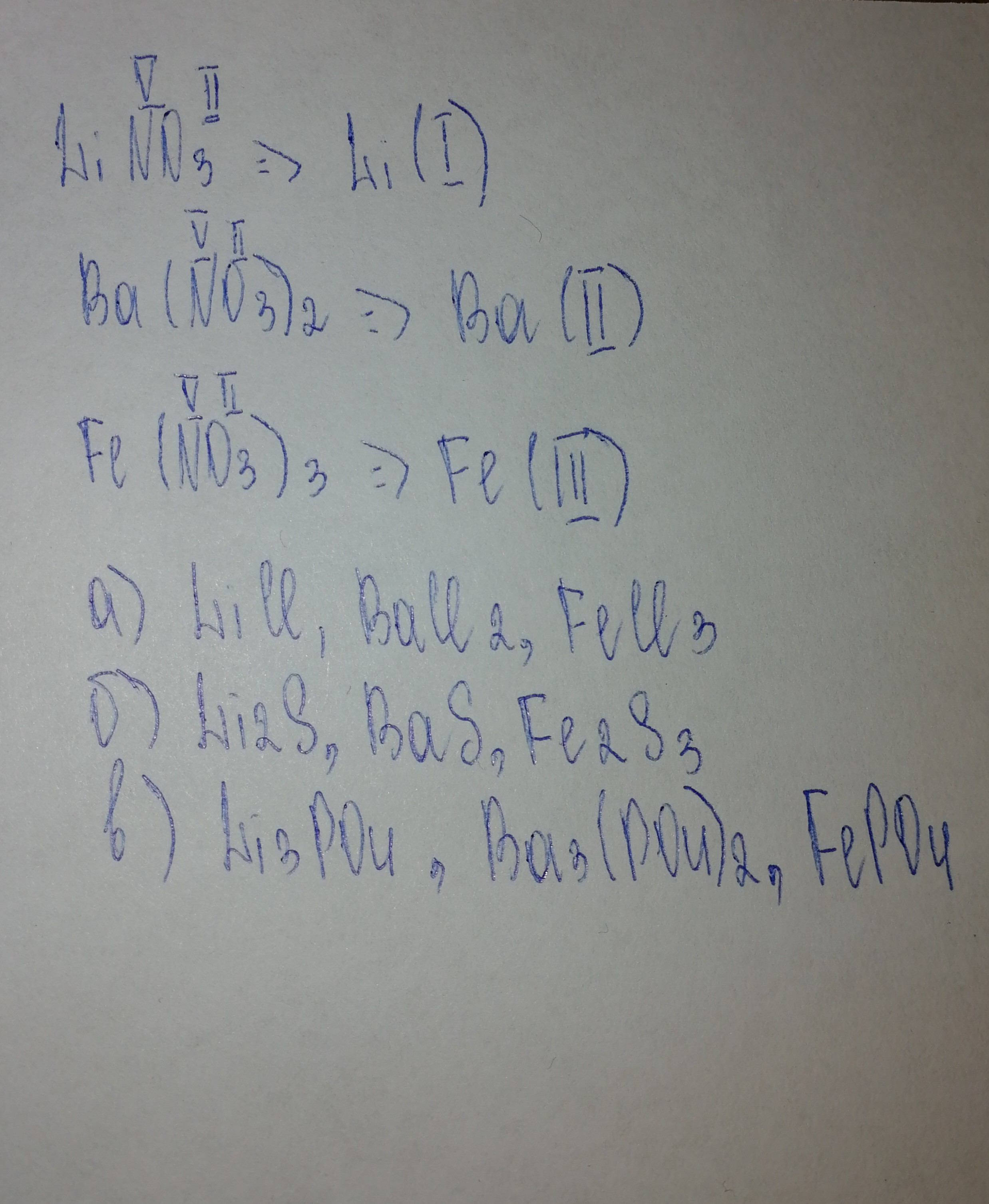 Состав нитратов лития, бария и железа отражают формулы LiNO3, Ba(NO3)2, Fe(NO3)3. Используя эти формулы, определите значения валентности атомов металлов. Составьте формулы солей, образованных этими металлами и кислотными остатками: