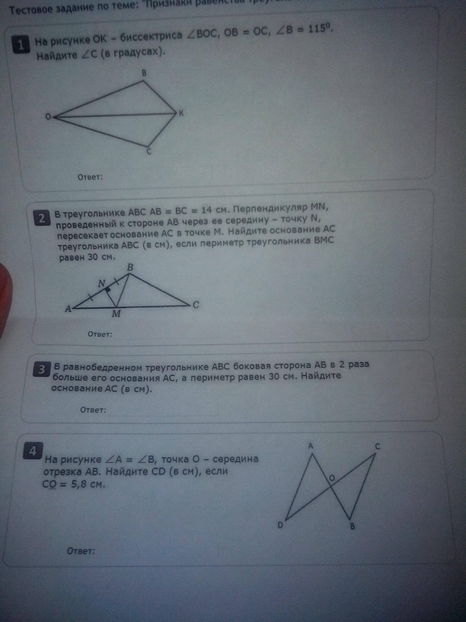 1. Треугольники ВОК и СОК равны по двум равным сторонам (ОВ = Ос по усовию, ок - общая) и углу между ними( ВОК = СОК, так как биссектриса поделила угол ВОС пополам). Соответственно, если угол В = 115, то угол С = 115.
