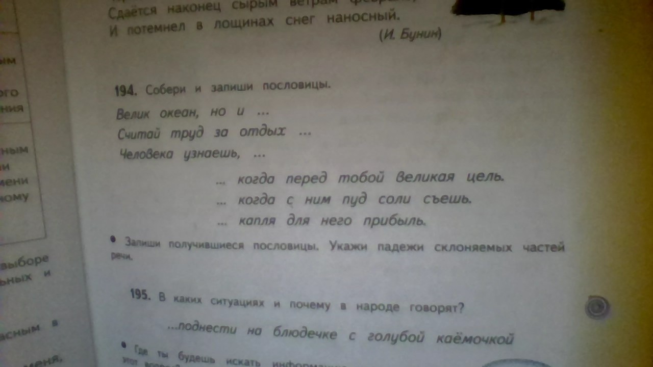 ЗАПИШИ ПОЛУЧИВШИЕСЯ ПОСЛОВИЦЫ. УКАЖИ ПАДЕЖИ СКЛОНЯЕМЫХ ЧАСТЕЙ РЕЧИ.