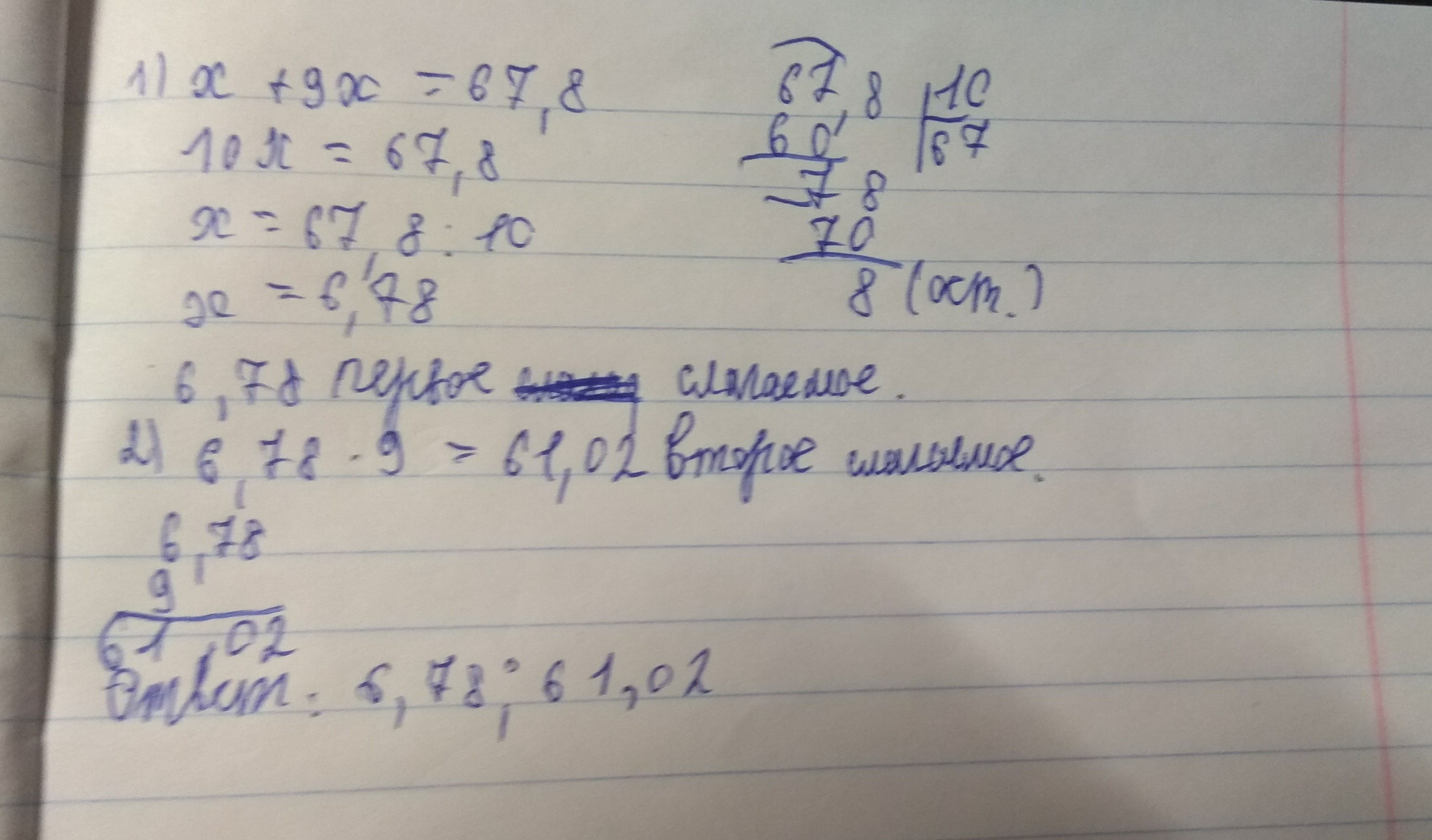 Пусть х первое слагаемое, тогда 9х второе слагаемое. По условию задачи сумма чисел равна 67,8 или (х+9х).