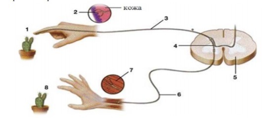 От двигательного нейрона идет импульс к мышце руки, чтобы та немедленно убрала руку. Этот процесс называется безусловным рефлексом