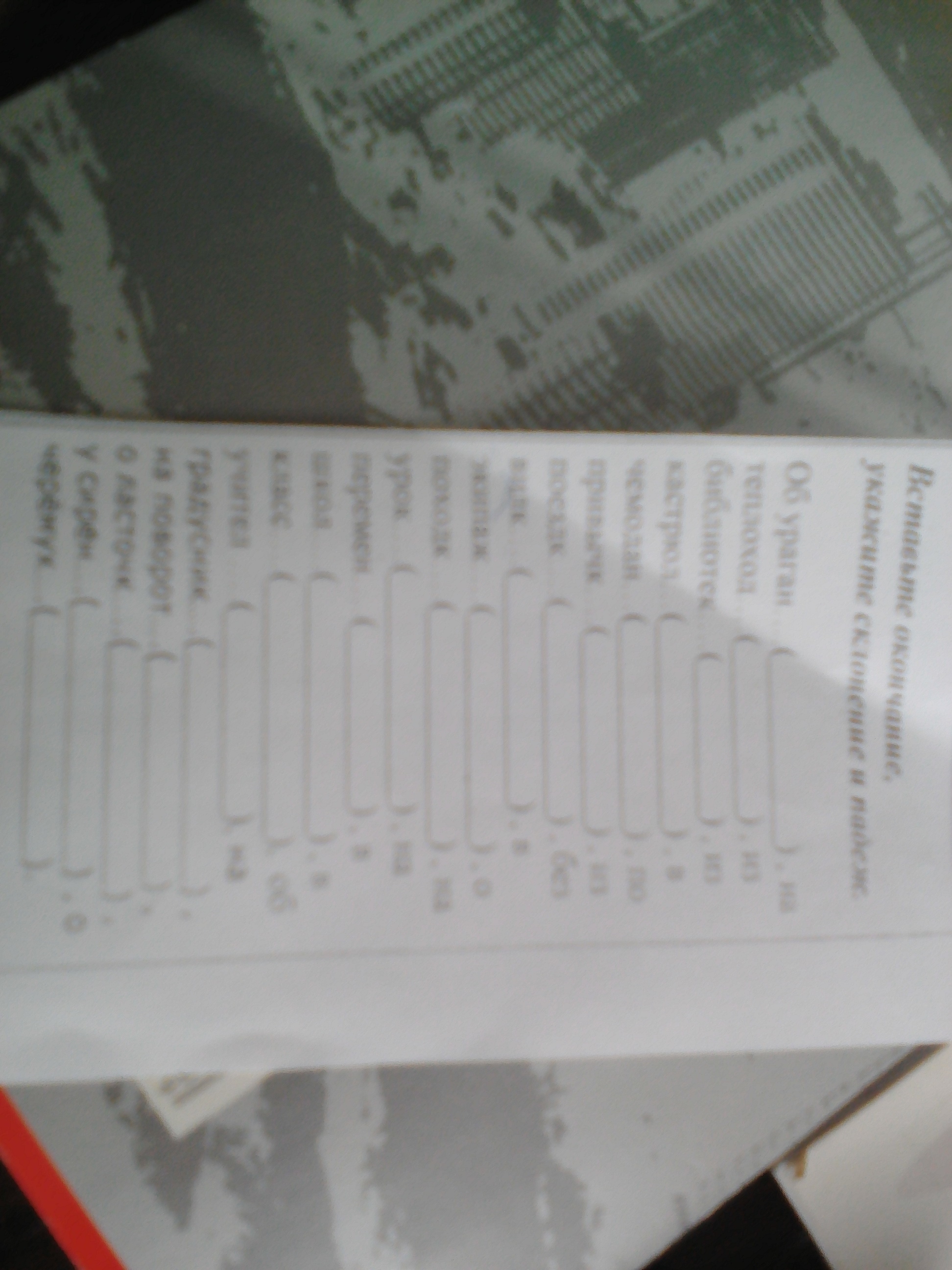 Об урагане (2 скл., П.п.), на теплоходе (2 скл., П.п.), из библиотеки (1 скл., Р.п.), из кастрюли (1 скл., Р.п.), в чемодане (2 скл., П.п.), по привычке (1 скл., Д.п.), из поездки (1 скл., Р.п.), без вилки (1 скл., Р.п.), в экипаже (2 скл., П.п.), о походке (1 скл., П.п.), на уроке (2 скл., П.п.), на перемене (1 скл., П.п.), в школе (1 скл., П.п.), в классе (2 скл., П.п.), об учителе (2 скл., П.п.), на градуснике (2 скл., П.п.), на повороте (2 скл., П.п.), о ласточке (1 скл., П.п.), у сирени (3 скл., Р.п.), о черёмухе (1 скл., П.п).