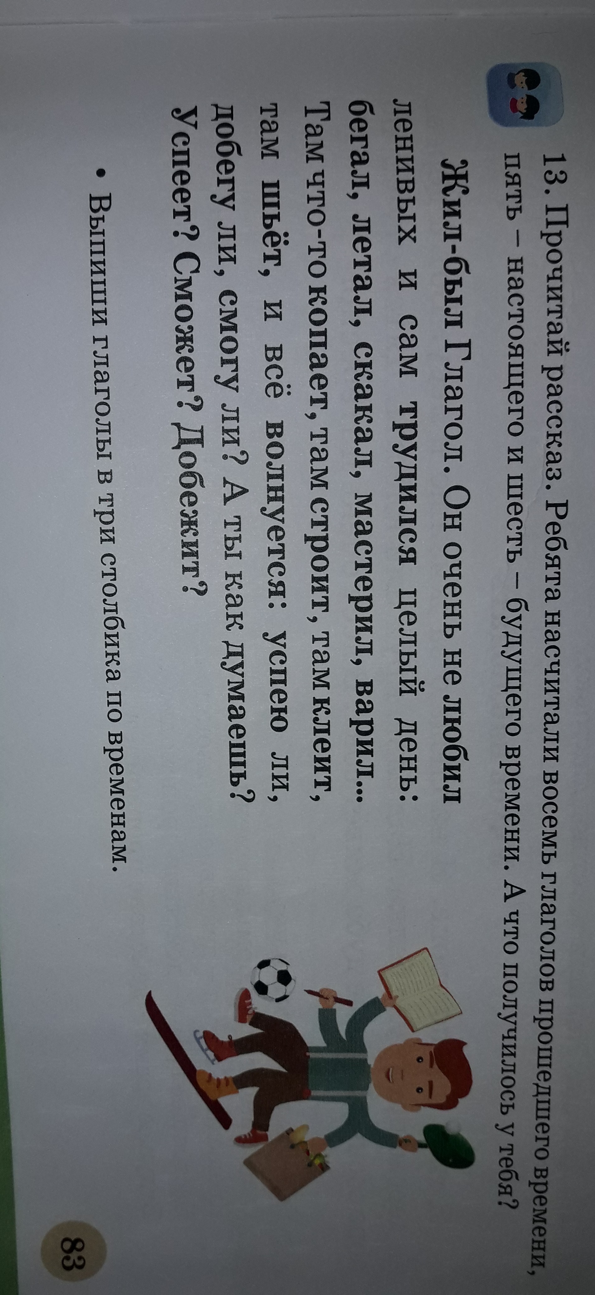 прош.время=жил-был,не любил,трудился,бегал,летал,скакал,мастерил,варил.