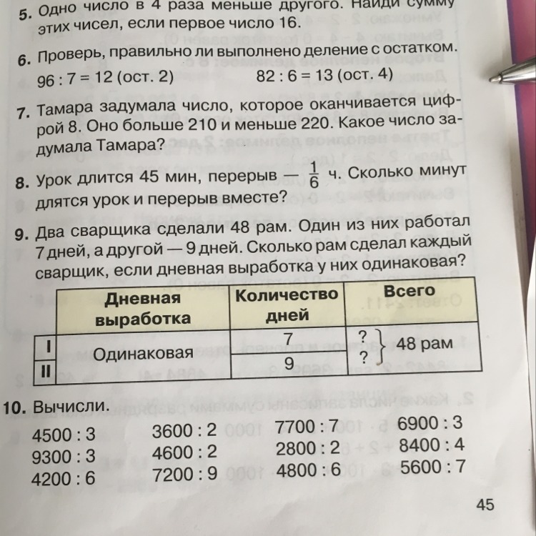 Условие задачи: Всего сделали - 48 рам, 1-й сварщик - ? рам за 7 дней, 2-й сварщик - ? рам за 9 дней. Решение: 1) определим общее количество рабочих дней: 7 + 9 = 16 дней; 2) найдем дневную выработку каждого сварщика: 48:16 = 3 рамы в день; 3) вычислим количество рам сделанных каждым сварщиком: 7·3 = 21 рама, 9·3 = 27 рам. Ответ: 1-й сделал - 21 раму, 2-й - 27 рам.