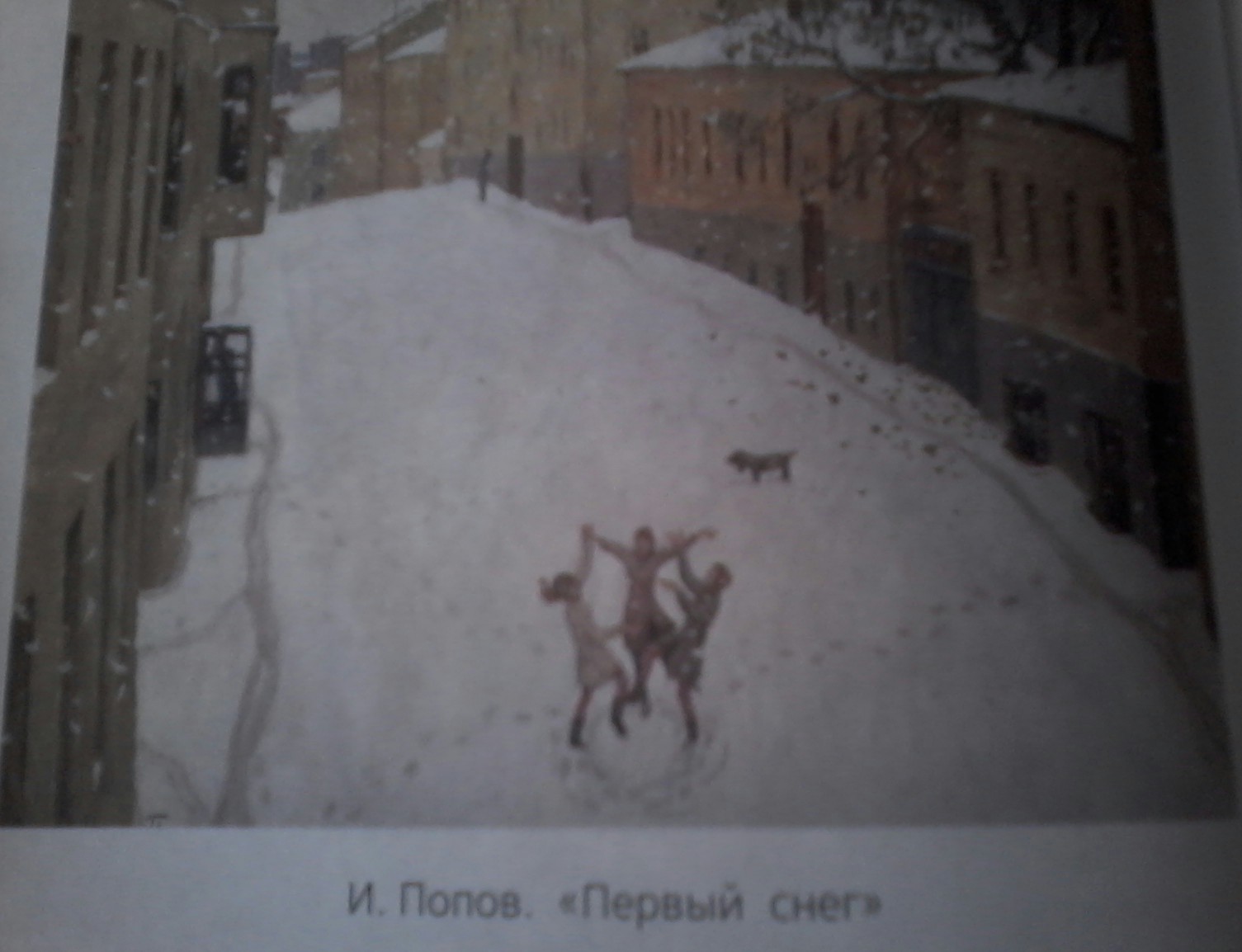 Передо мной картина великого мастера И.Попова под названием "Первый снег". Она настолько завораживает, что хочется смотреть на нее и просто улыбаться, а описывать ее от первого лица, что я и сделаю.Мы с нетерпением ждали первого снега, но его всё не было. Небо было серым, и любой день казался пасмурным. Каждое утро я с надеждой подбегал к окну, мечтая увидеть белое чудо. Но улица оставалась серой и безжизненной. И вдруг однажды утром мама зашла ко мне в комнату, загадочно улыбаясь. Я сразу понял: снег! Мигом спрыгнув с кровати, я очутился у окна.От неожиданности я даже зажмурился. Все вокруг сияло и переливалось разными красками. Снег лежал кругом: на деревьях, на крышах, на телефонной будке под моим окном, на земле. И всё шёл и шёл. Снежинки кружились в нежном вальсе и искрились на солнце, которое не выдержало такой красоты и вышло из своего убежища. Было так светло и радостно! Грязновато-жёлтые дома смотрелись как-то по-особенному жёлто на белоснежном фоне. Ровный слой на дороге не был поврежден следами шин от проезжающих машин, и только по краям, ближе к зданиям, утренние прохожие уже протоптали едва заметные тропинки-дорожки.