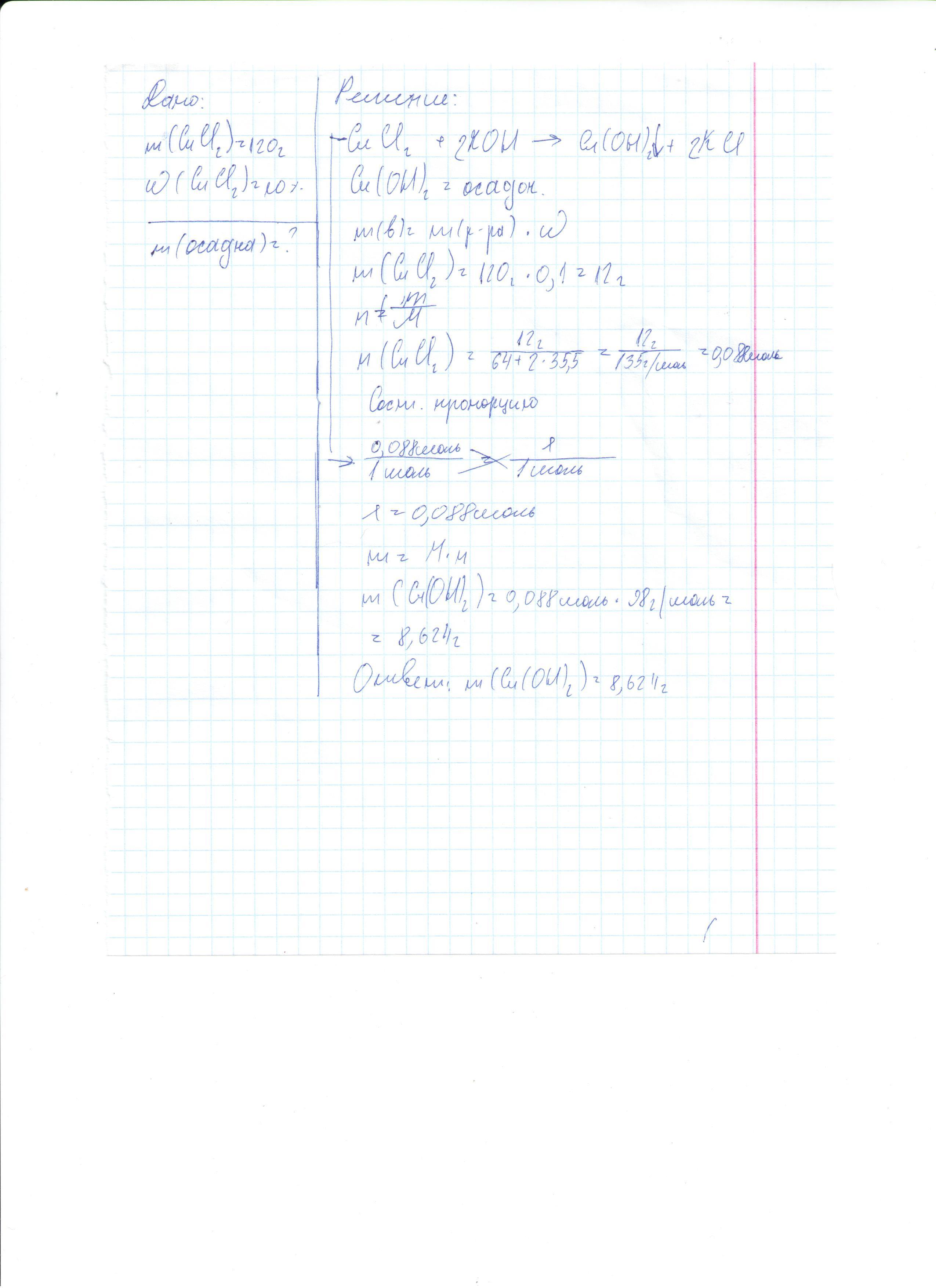 Сколько граммов осадка образуется при взаимодействии 120 г 10%- ного раствора хлорида меди (3) с необходим количеством гидроксида калия