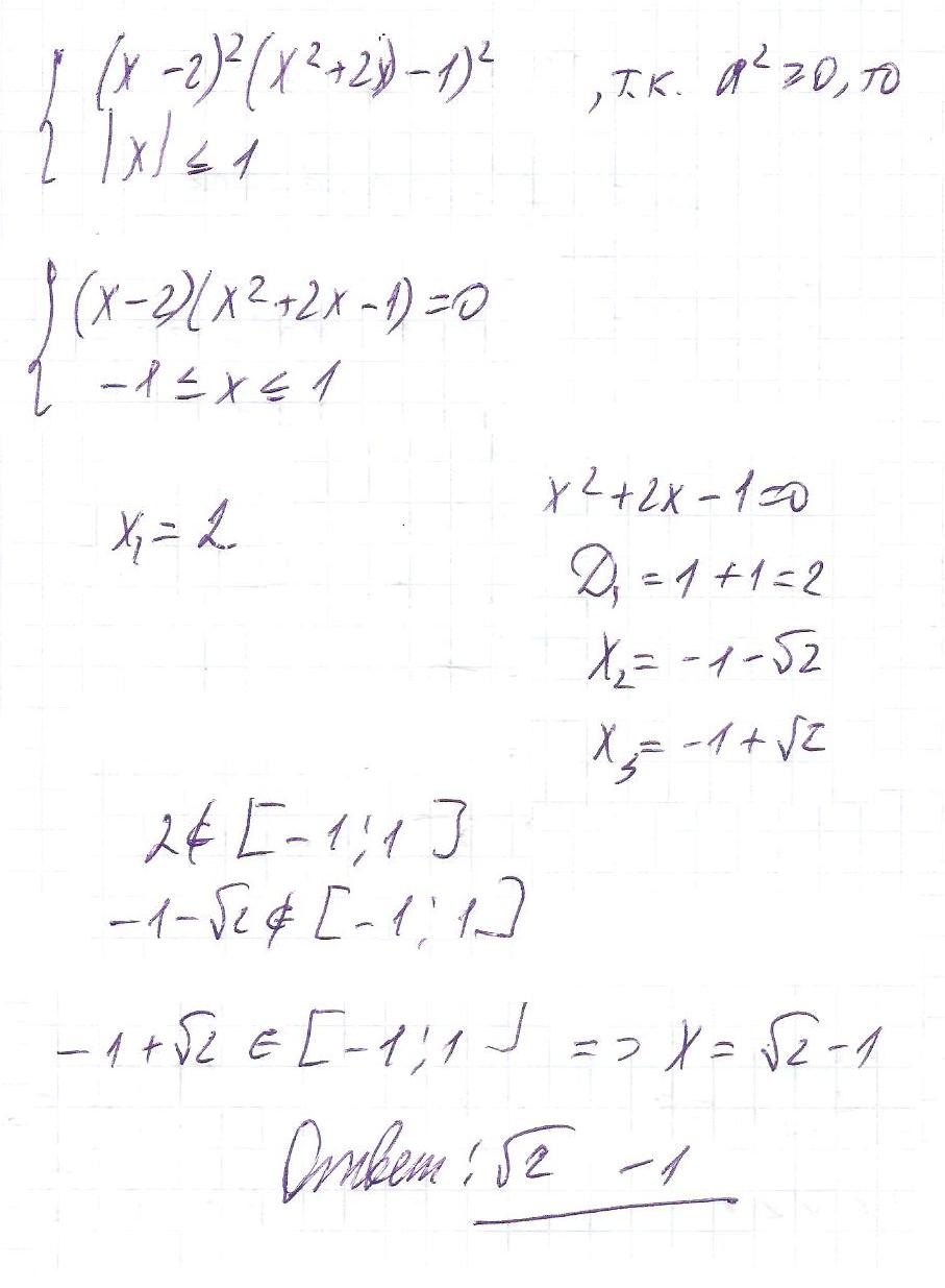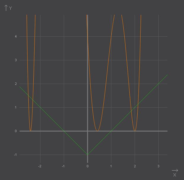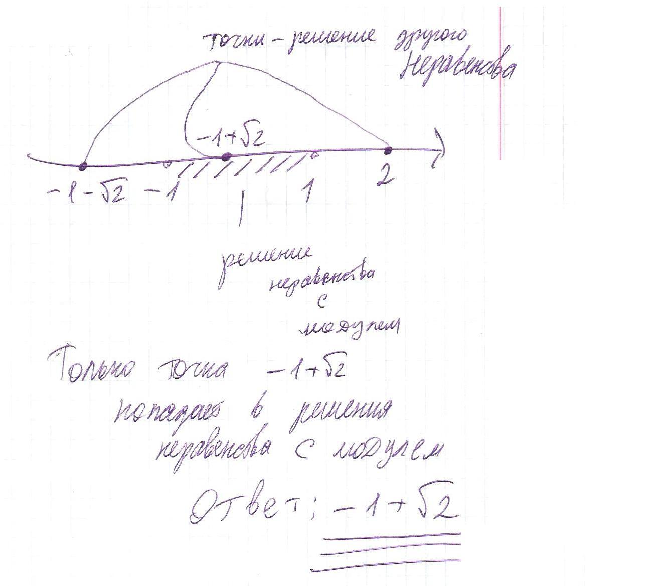 По поводу графика: ищем такие точки, в которых график модуля (зеленый) не ниже оси абсцисс и график произведения квадратичных функций (оранжевый) также не ниже оси абсцисс. В вариантах у нас три точки - пересечения оранжевого графика с осью х, но только одна из них (в ответе написано какая) лежит на отрезке, где модуль не выше оси х.
