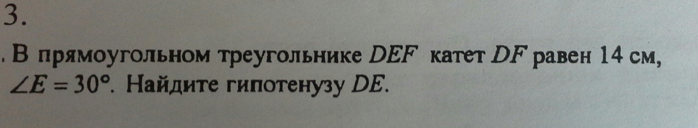 Тогда гипотенуза DE = 28 см (т.к. против угла 30° лежит катет, равный половине гипотенузы) Соответственно гипотенуза в 2 раза больше катета.