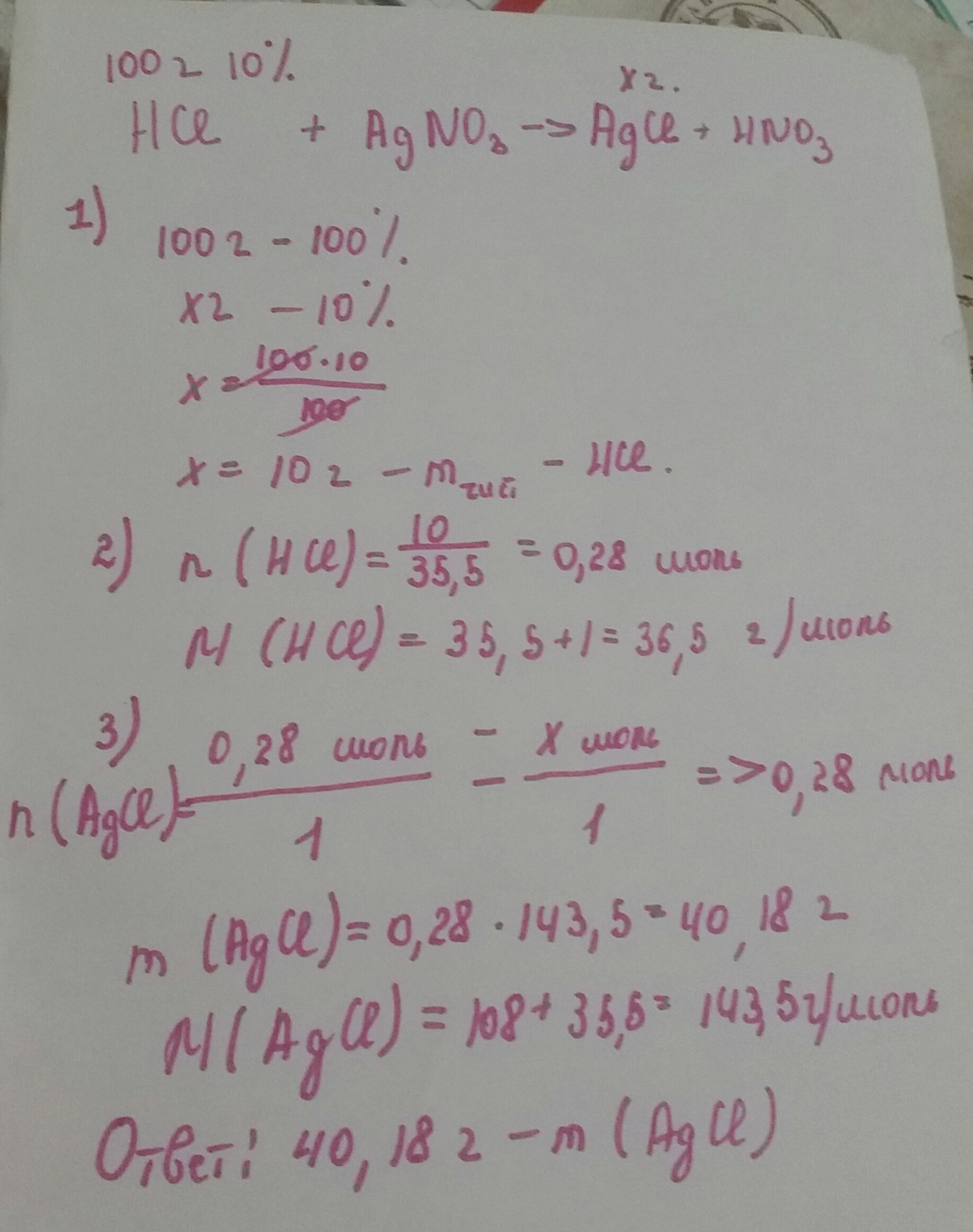 к 100 г 10 процентного раствора соляной кислоты hcl прилили избыток нитрата серебра agno3 получили хлорид серебра и азотную кислоту вычислите массу полученного осадка хлорида серебра agcl
