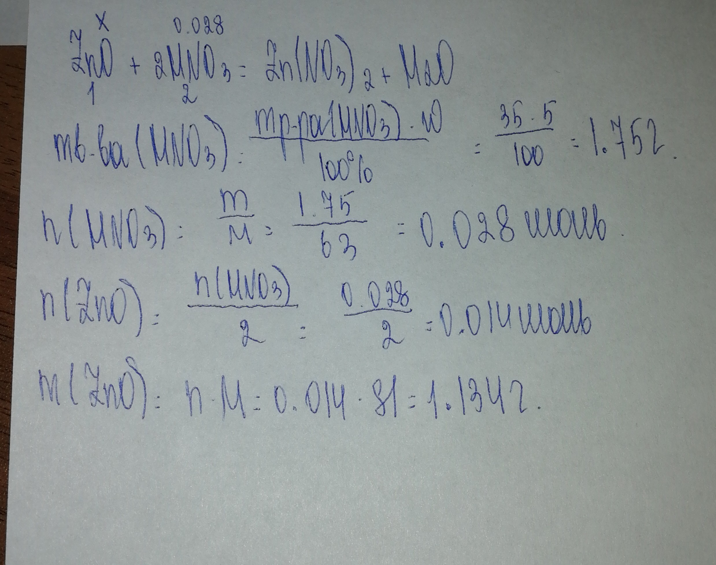Найти массу оксида цинка, выдилившегося при взаимодействии с 35г 5%-го раствора азотной кислоты. ZnO+2HNO₃ → Zn(NO₃)₂+H₂O