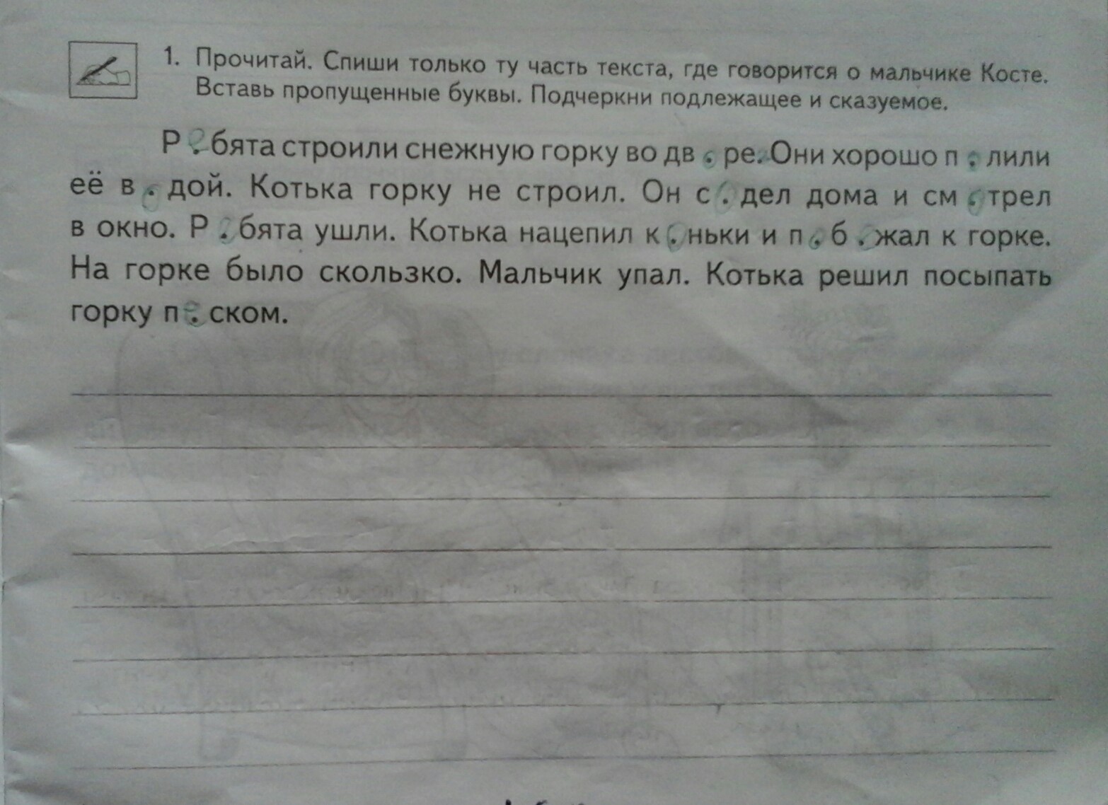 Ребята строили снежную горку во дворе.Они хорошо полили ее водой. Котька горку не строил.Он сидел дома и смотрел в окно.Ребята ушли.Котька нацепил коньки и побежал к горке.На горке было скользко.Мальчик упал.Котька решил посыпать горку песком.