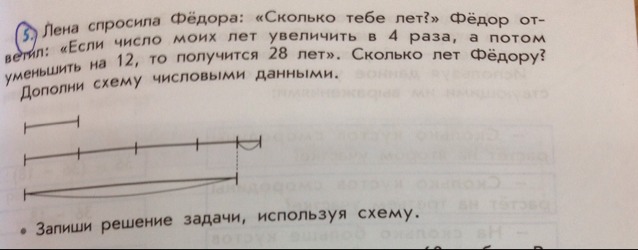 Лена спросила Фёдора :" сколько тебе лет?" Федор ответил :" если число моих лет увеличить в 4 раза , а потом уменьшить на 12, то получится 28 лет". Сколько лет Федору ? Дополни схему числовыми данными.